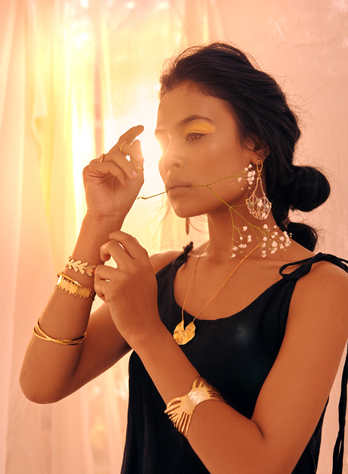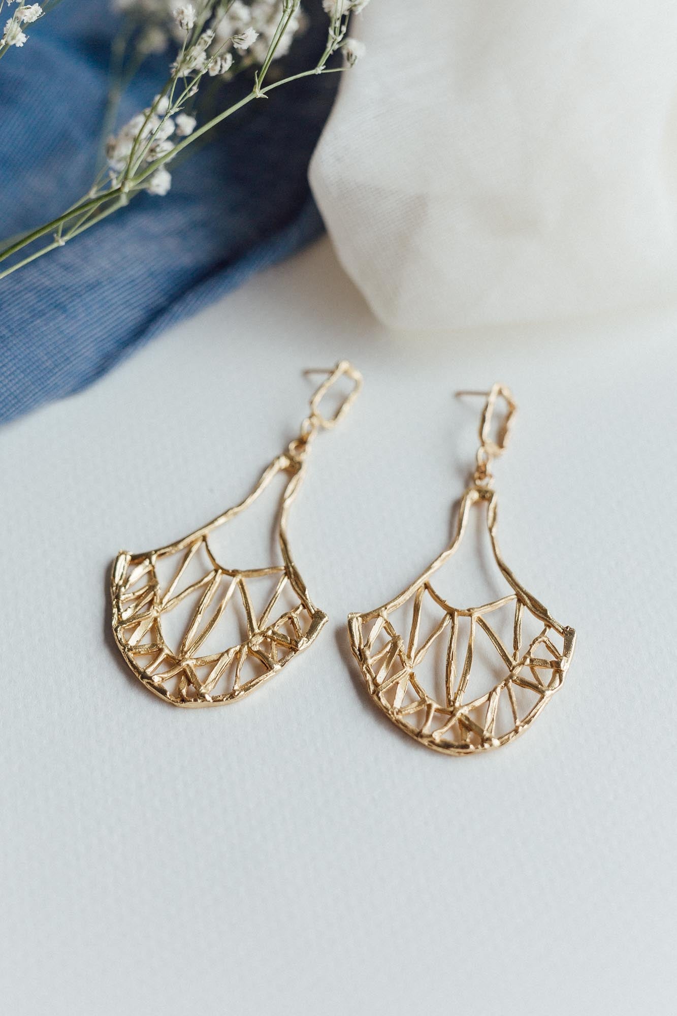 Disposición plana de dos aretes Topos Cucu en bronce bañado en oro, pintados a mano en verde salvia con granulación de vidrio, sobre fondo blanco.