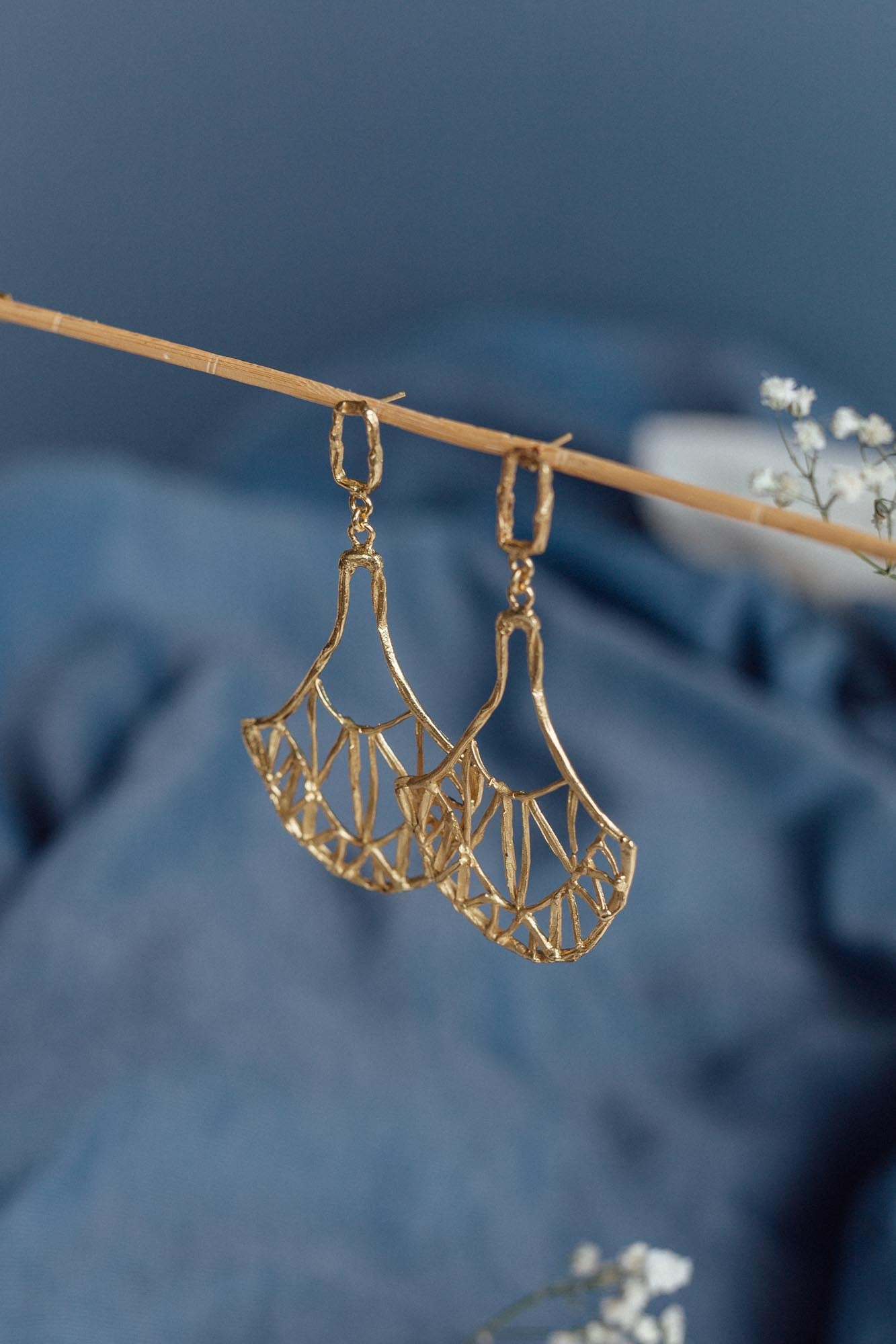 Par de aretes Topos Cucu en bronce bañado en oro, pintados a mano en color rust con granulación de vidrio, sobre fondo rosa pálido.