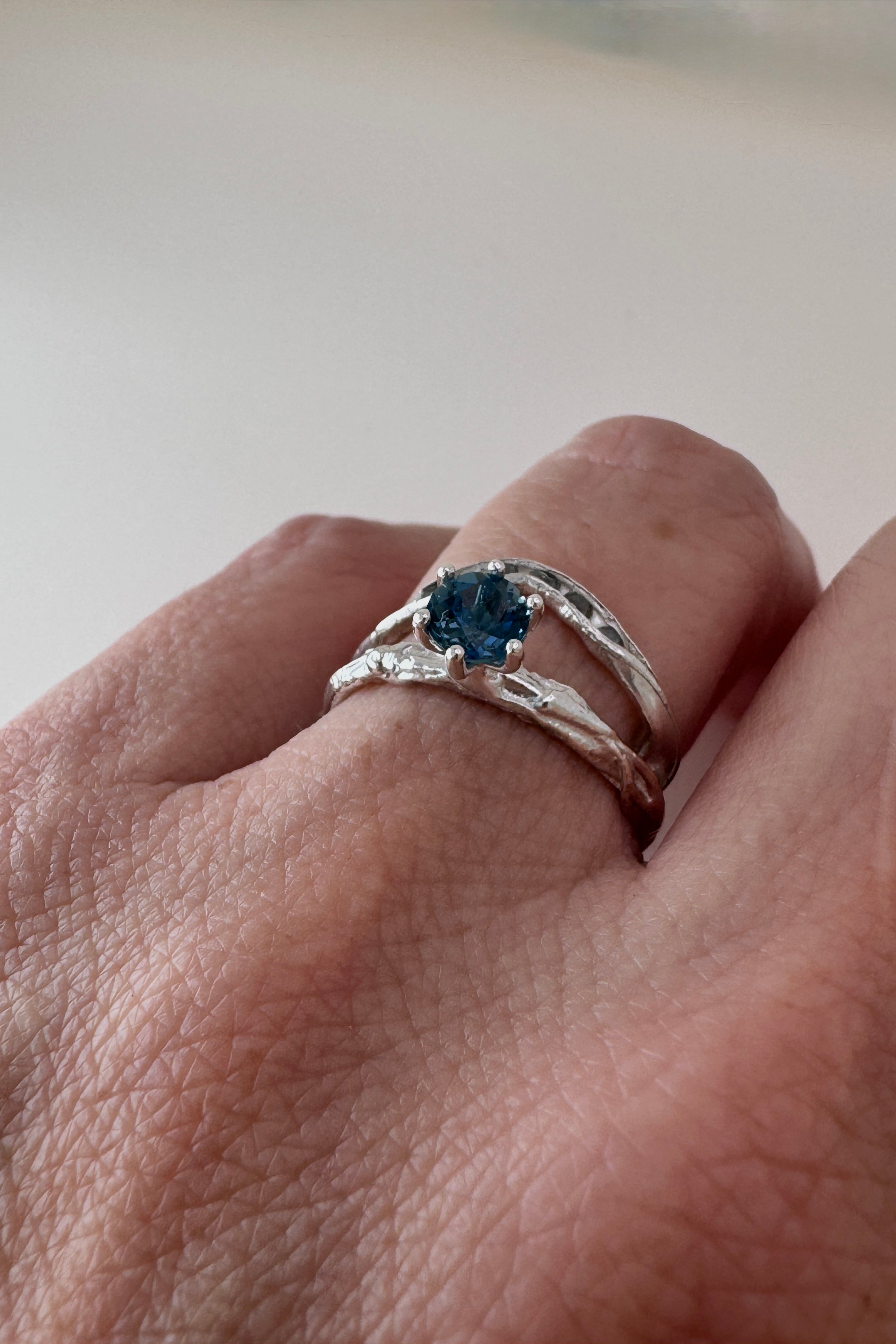 Este anillo viene empacado en un tronquito de cedro, canelo o roble. Estos llevan semillas de lavanda en su interior que se mezclan con el olor de la madera. Cada caja es única, como nuestros anillos.