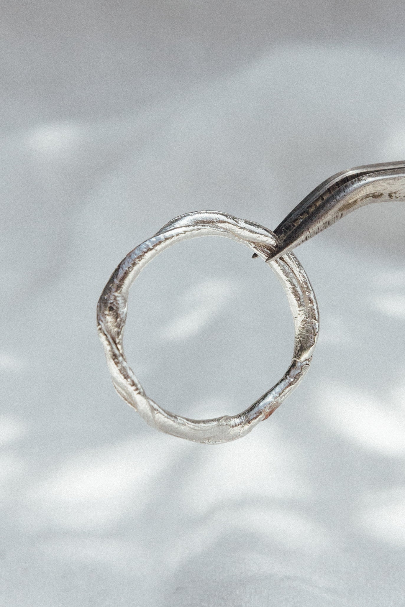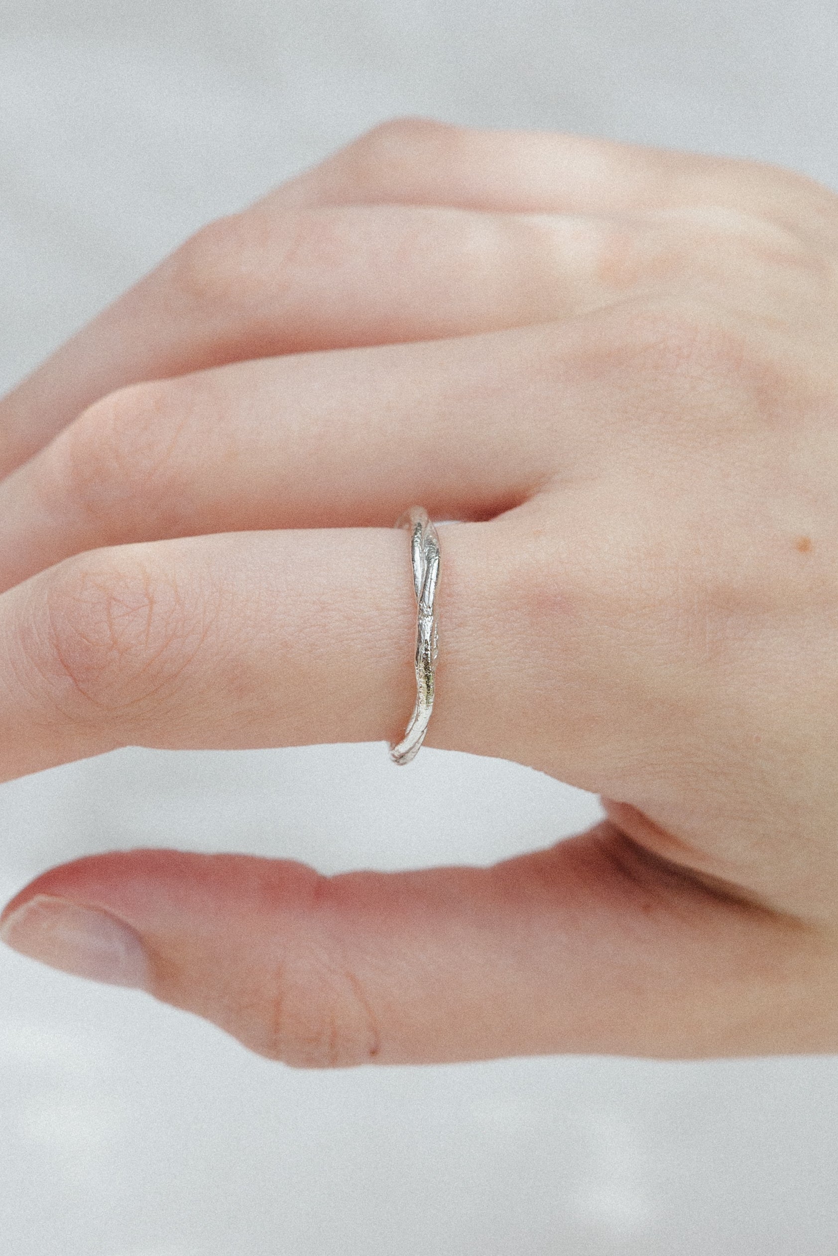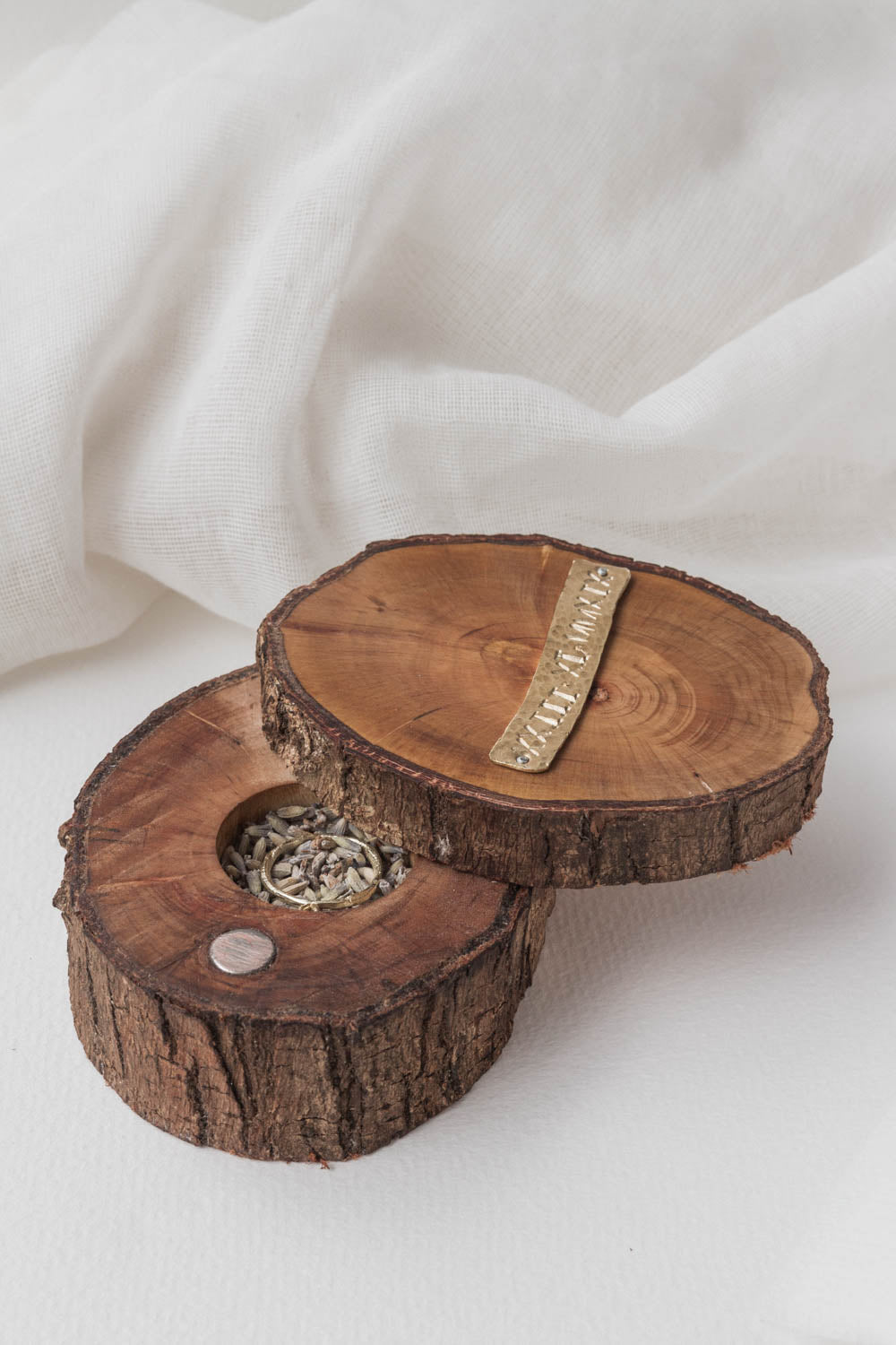 Este anillo viene empacado en un tronquito de cedro, canelo o roble. Estos llevan semillas de lavanda en su interior que se mezclan con el olor de la madera. Cada caja es única, como nuestros anillos.