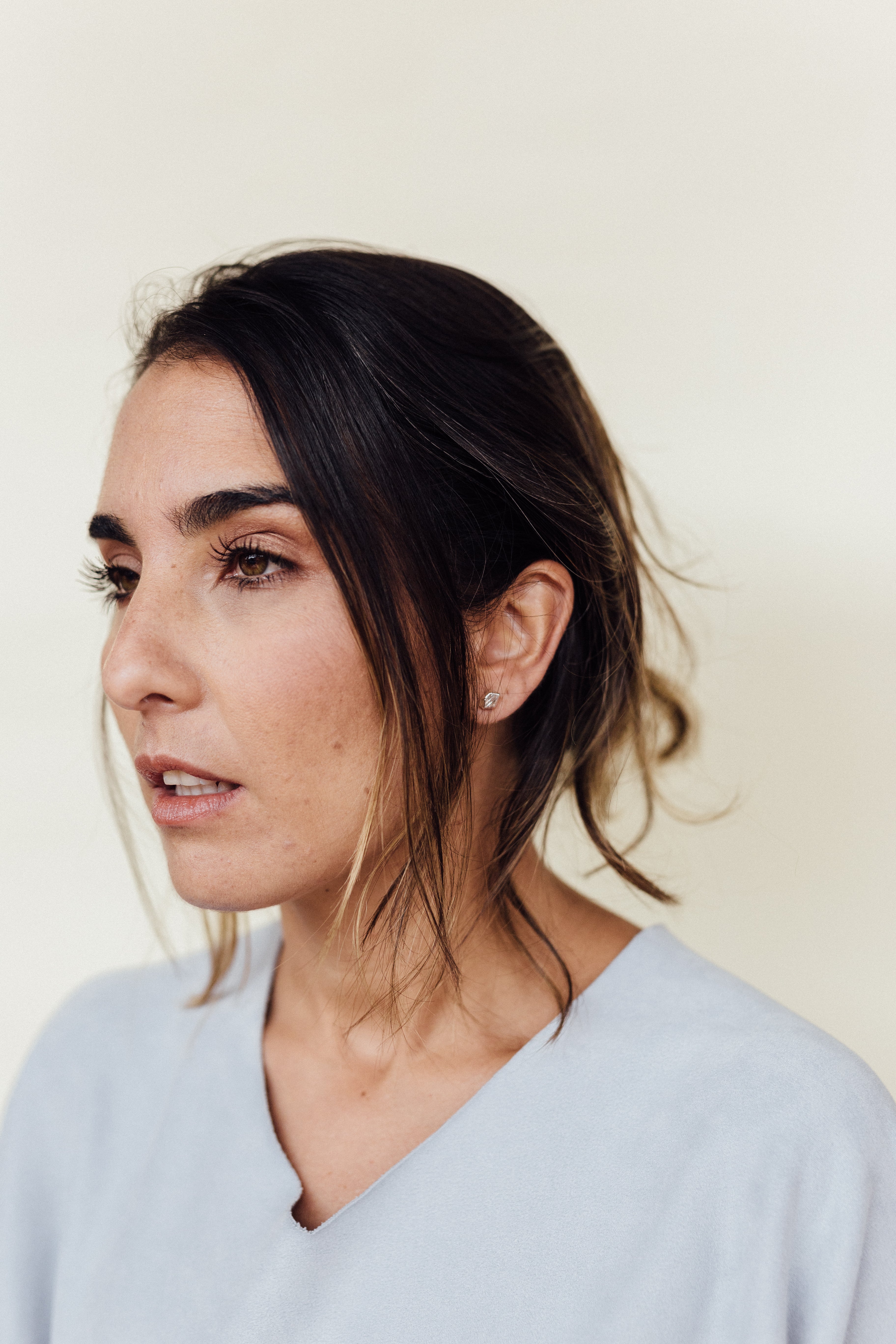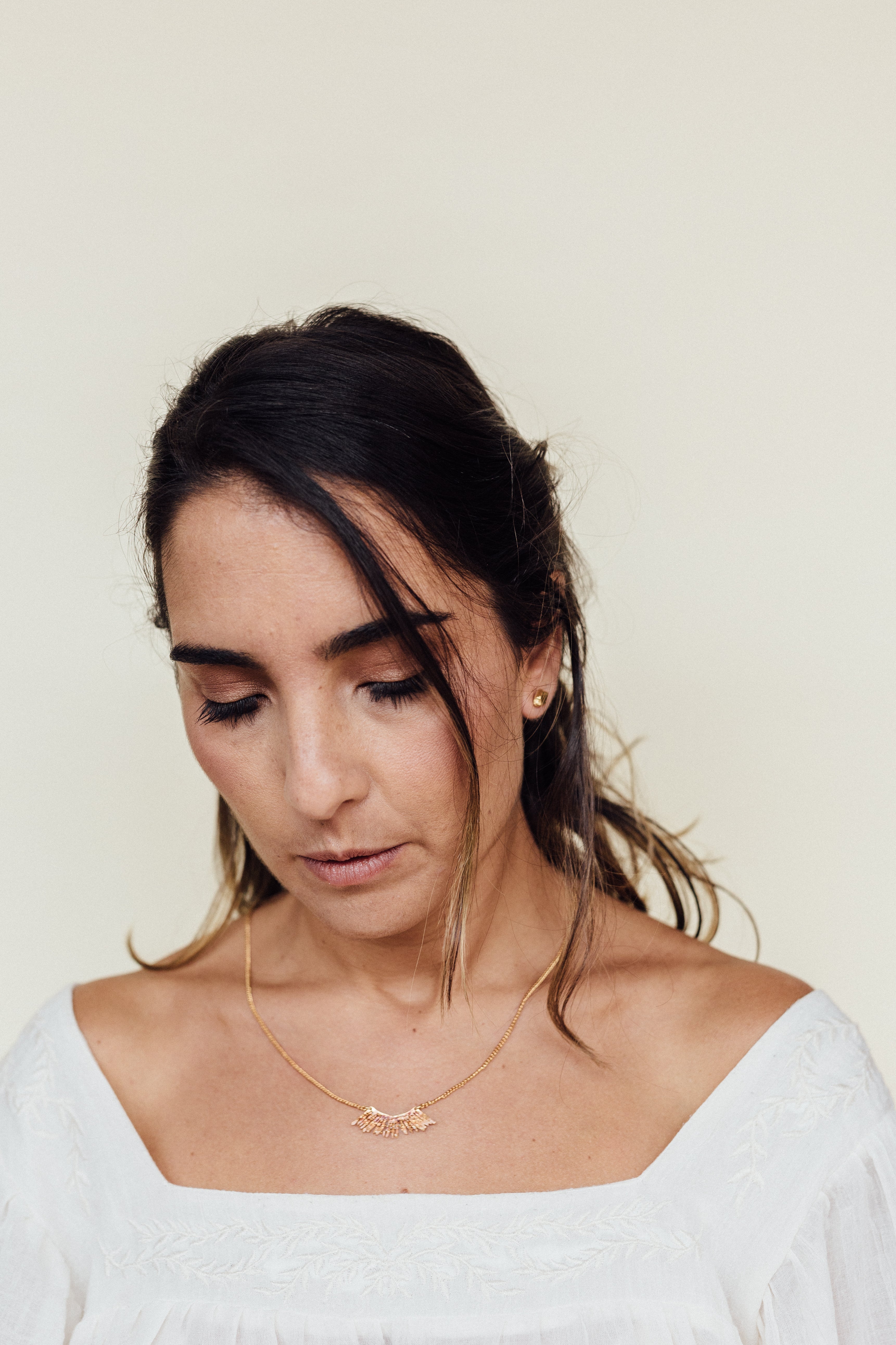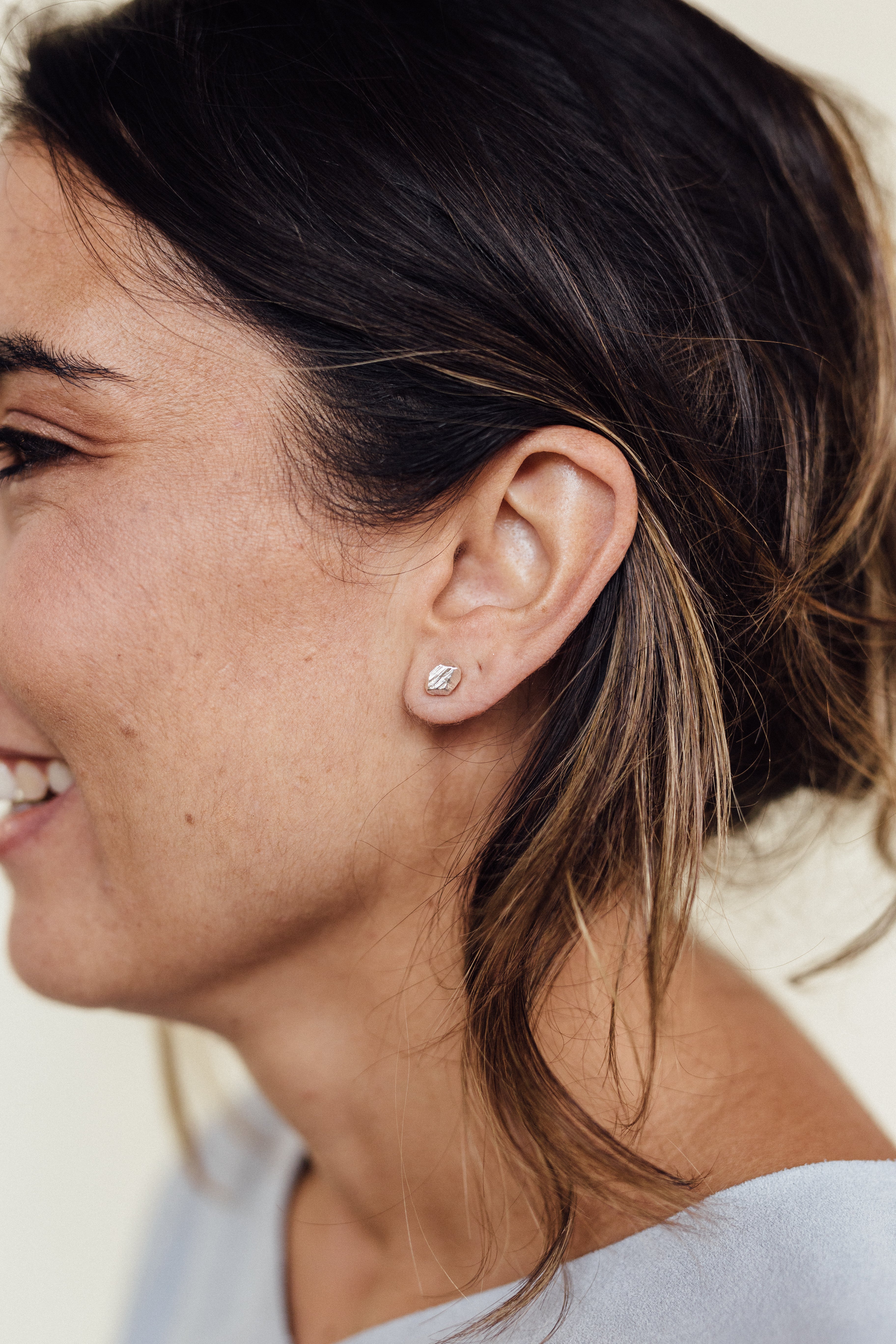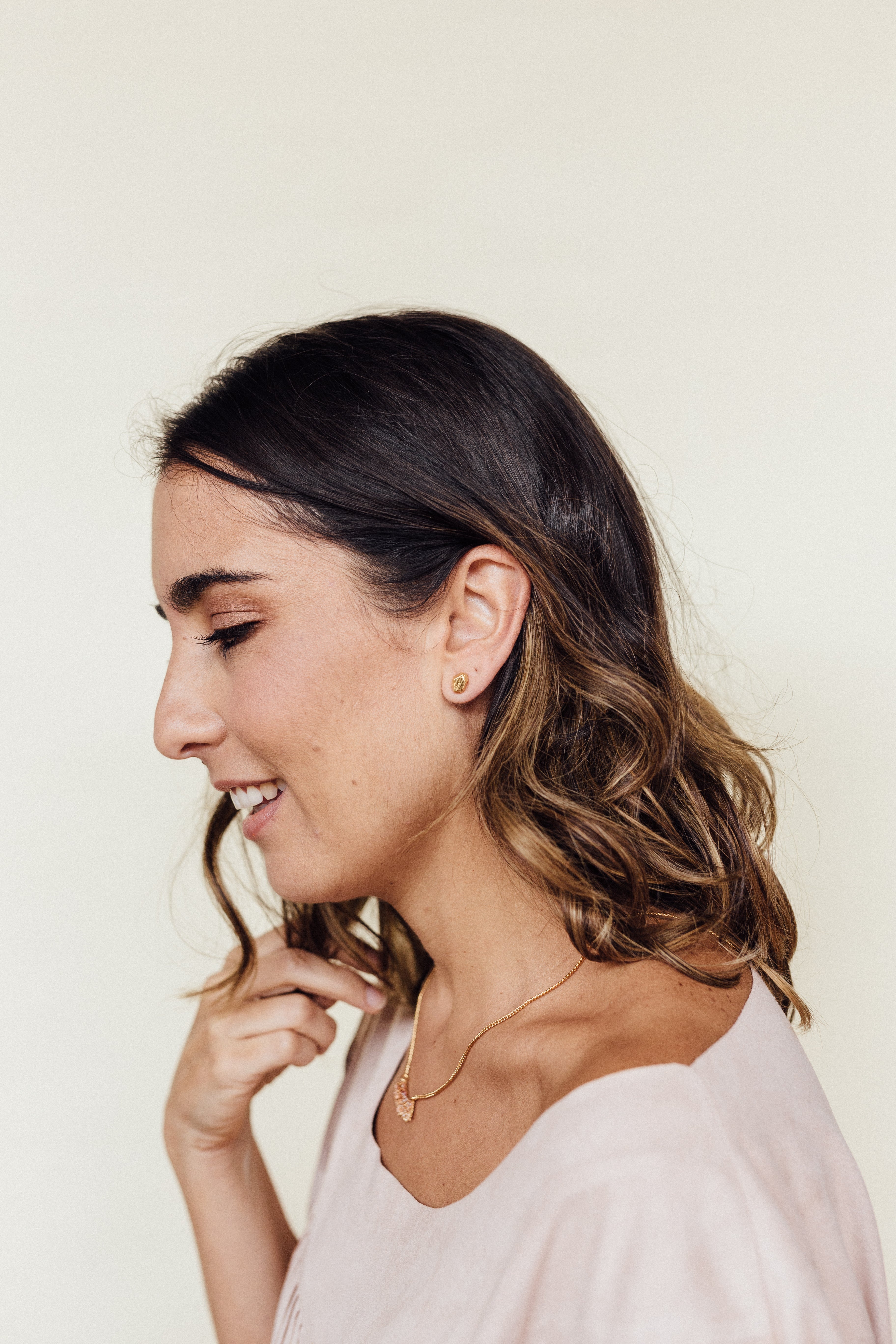 Primer plano lateral de la oreja de una mujer luciendo un arete Topos Cucu en bronce bañado en oro, pintado a mano en rosa con granulación de vidrio, cabello recogido detrás, sobre fondo neutro.