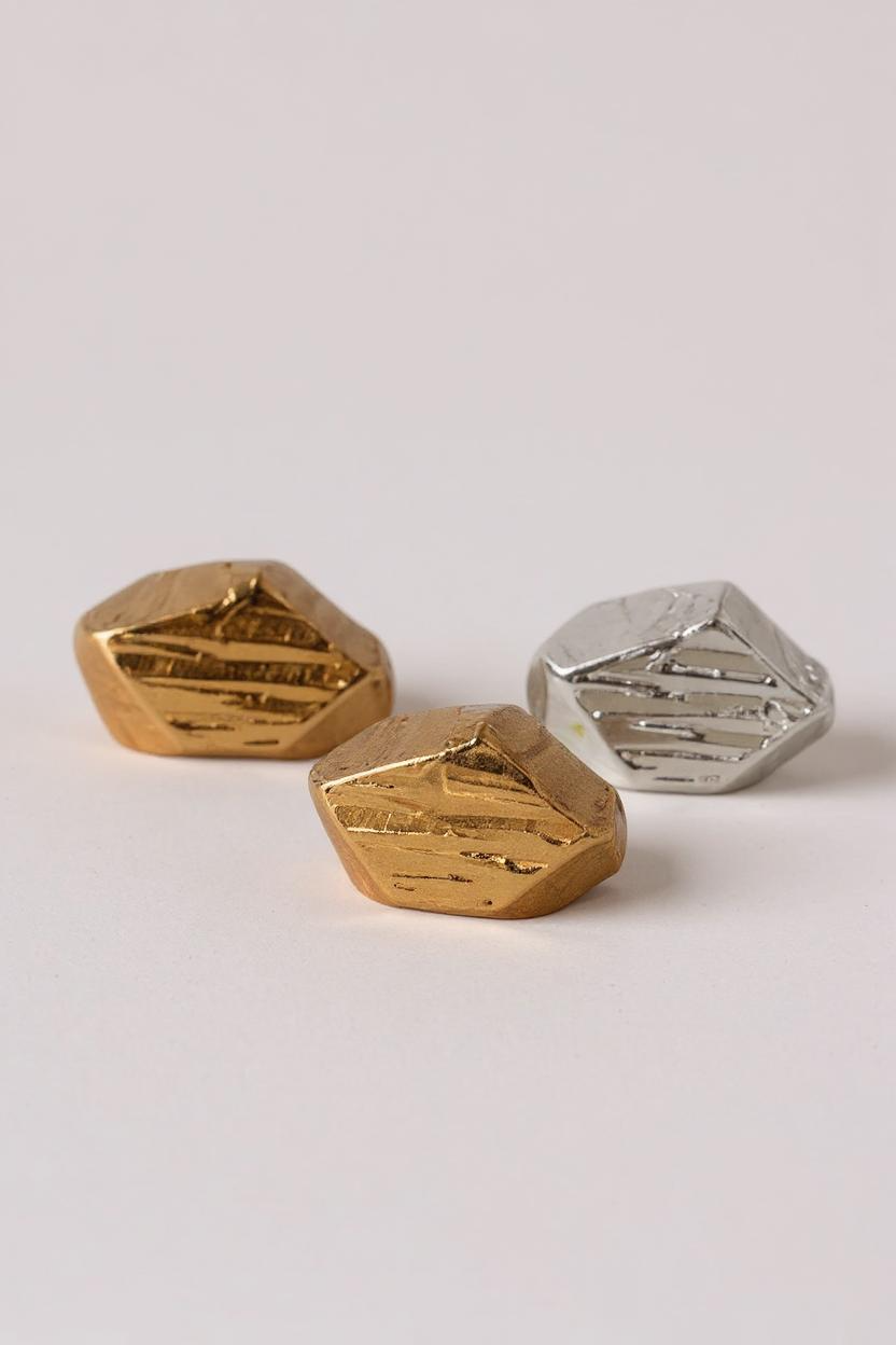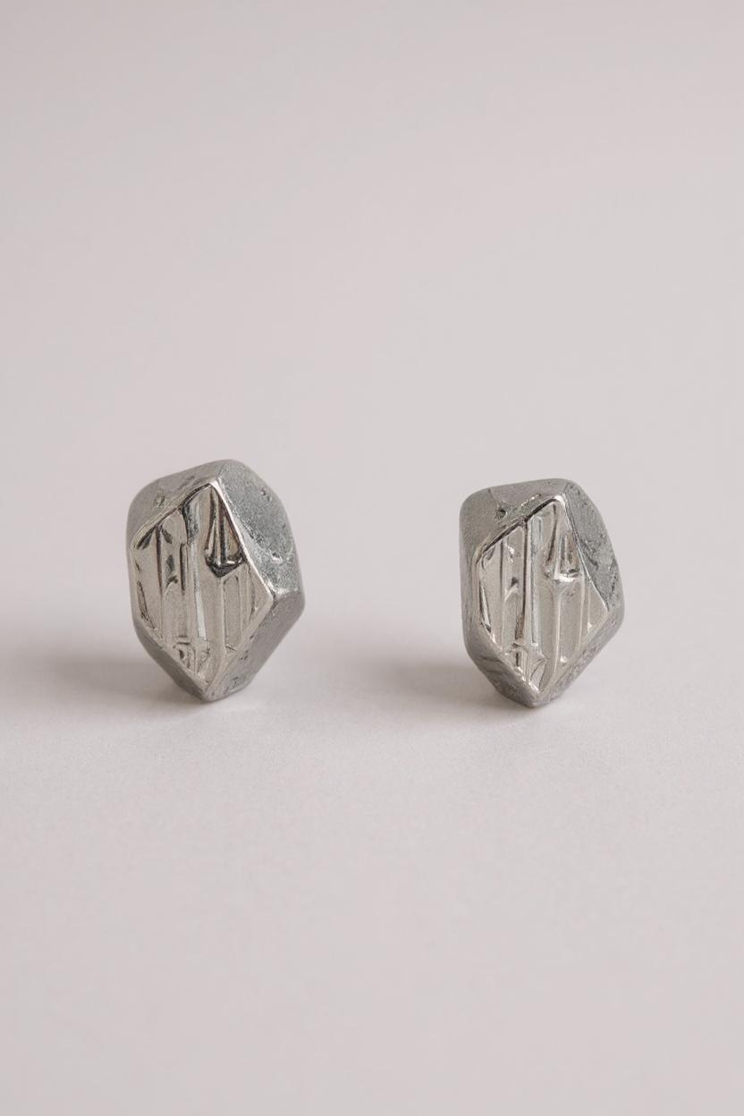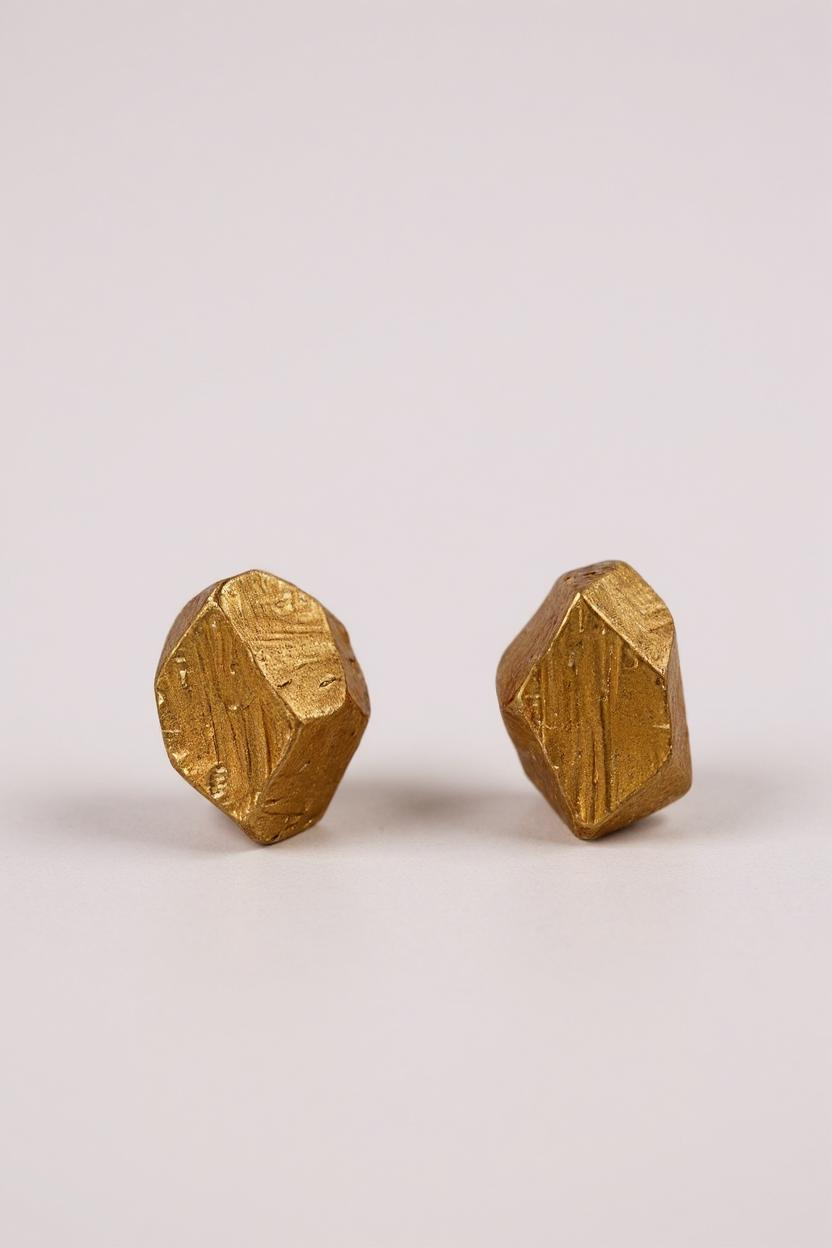 Par de aretes topos Nebula Mini en bronce bañado en oro, pintados a mano en  rust y con granulación de vidrio, sobre fondo blanco.