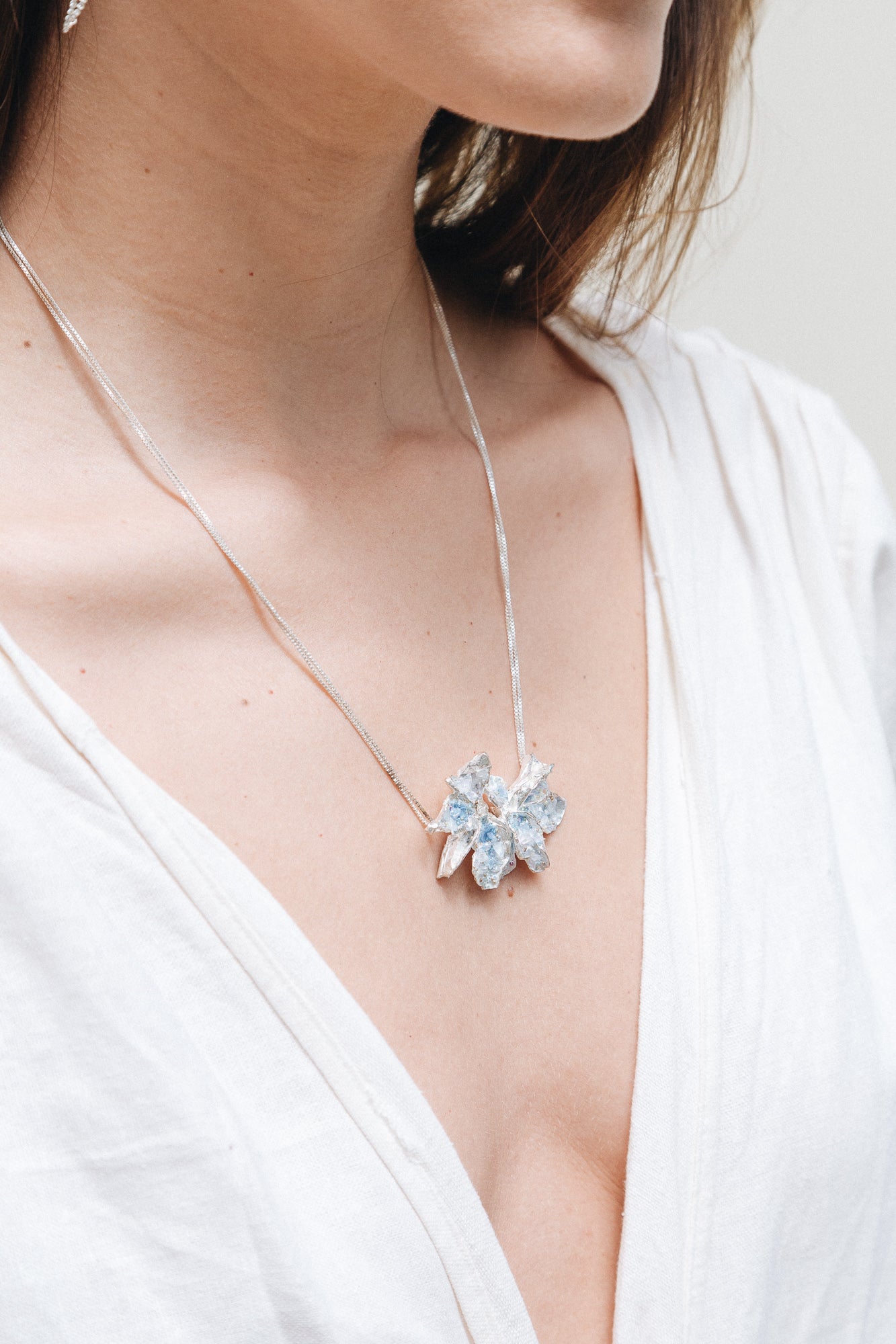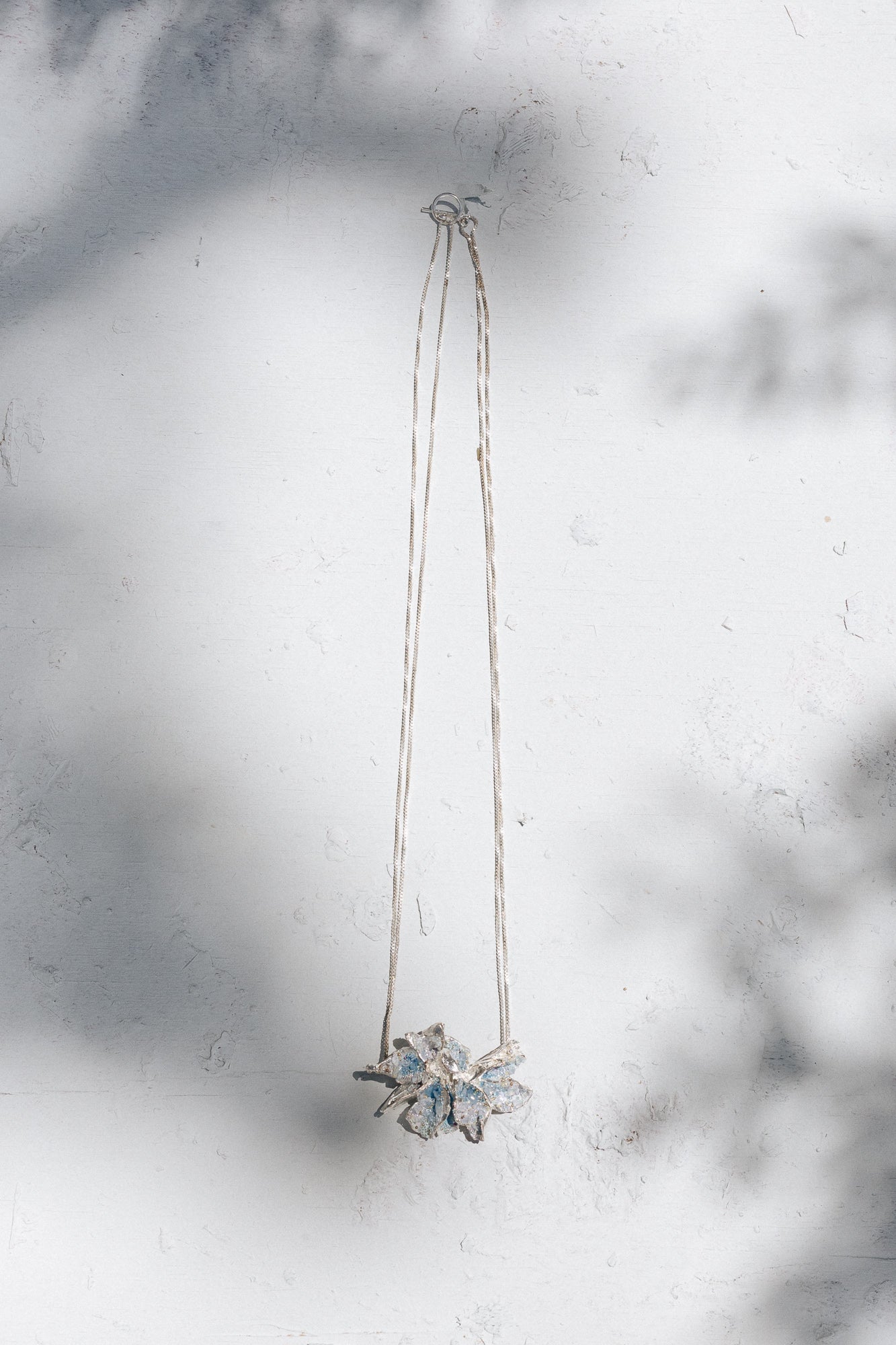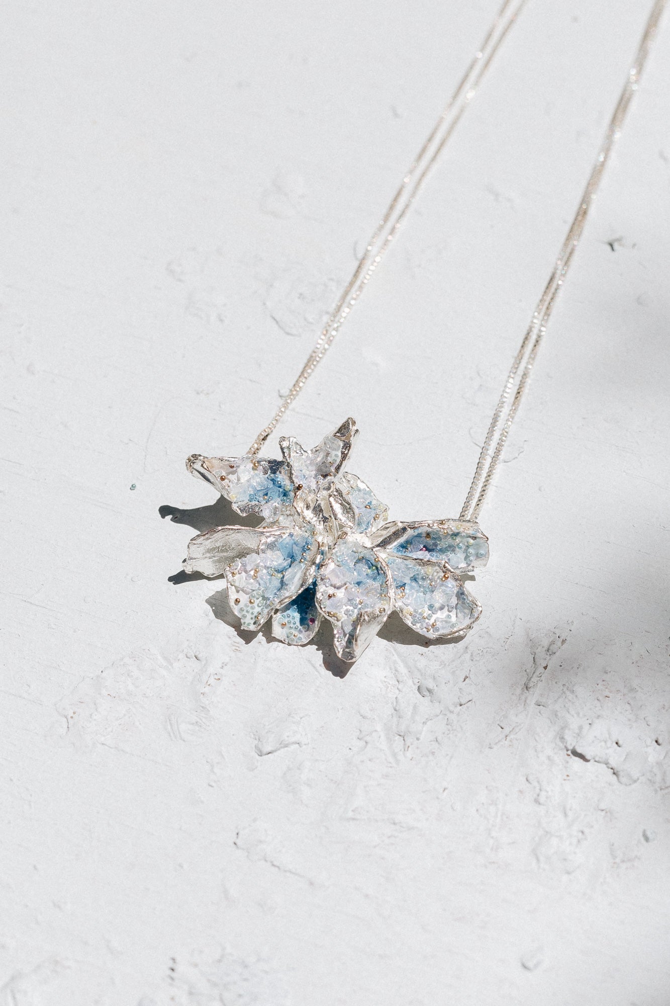Bronce con baño en Plata Ley 925, pintado a manos con granulación de vidrio.