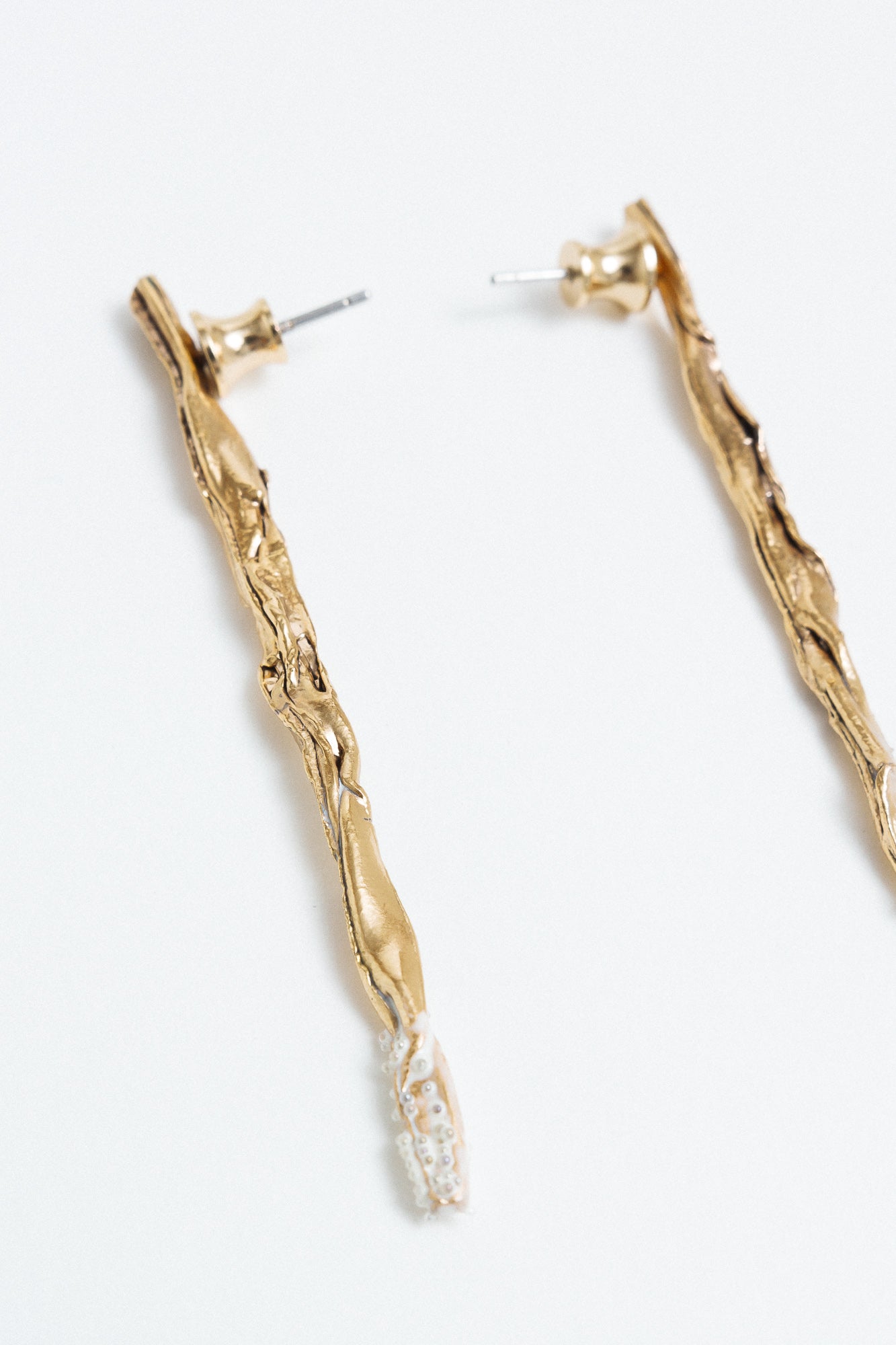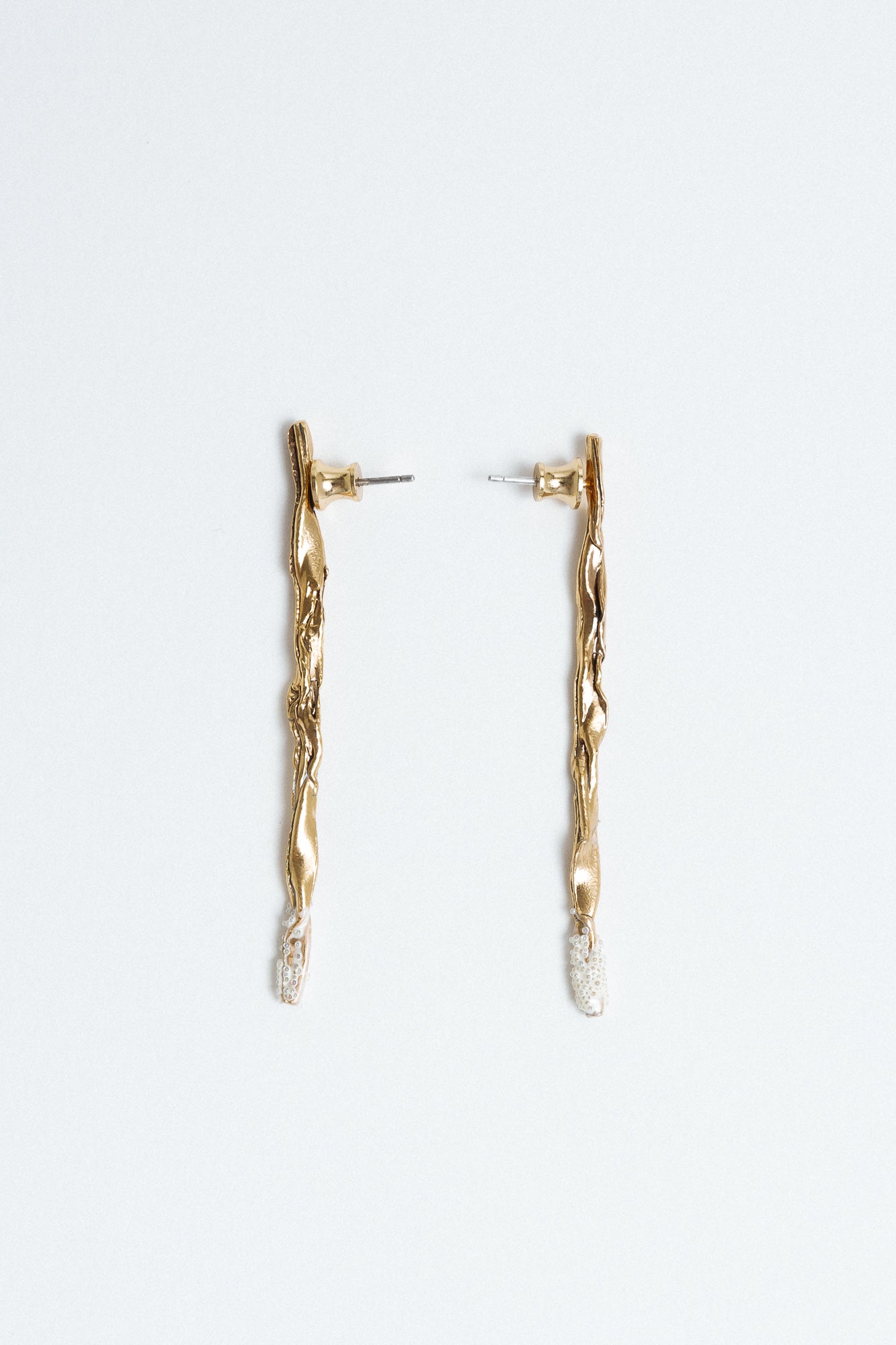 Par de aretes Topos Cucu en bronce bañado en oro, pintados a mano en color rust con granulación de vidrio, sobre fondo rosa pálido.