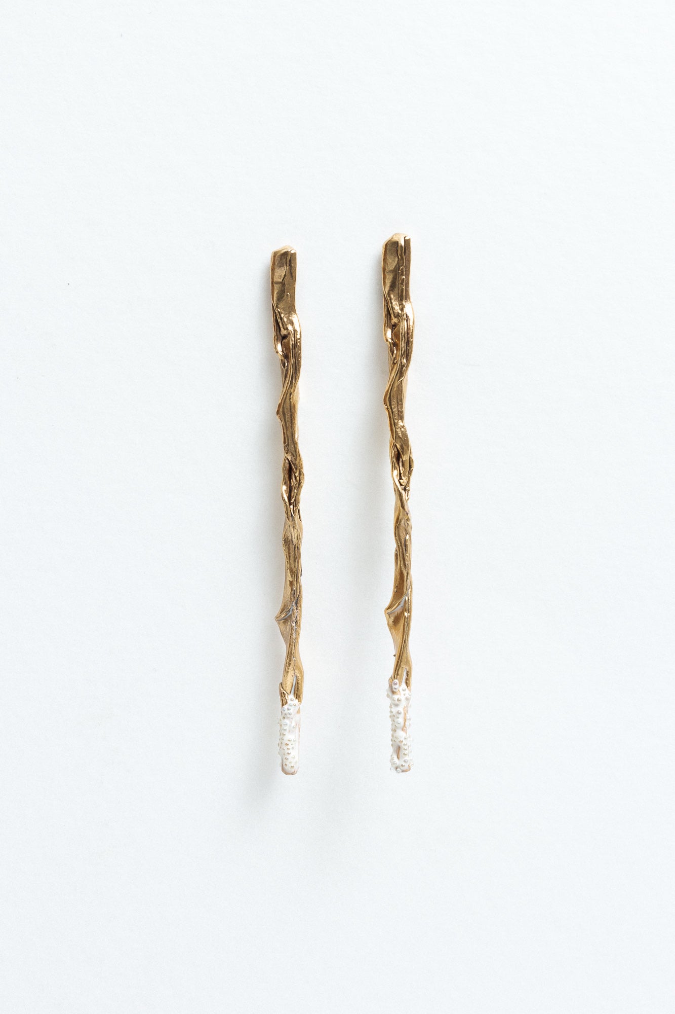 Disposición plana de dos aretes Topos Cucu en bronce bañado en oro, pintados a mano en verde salvia con granulación de vidrio, sobre fondo blanco.