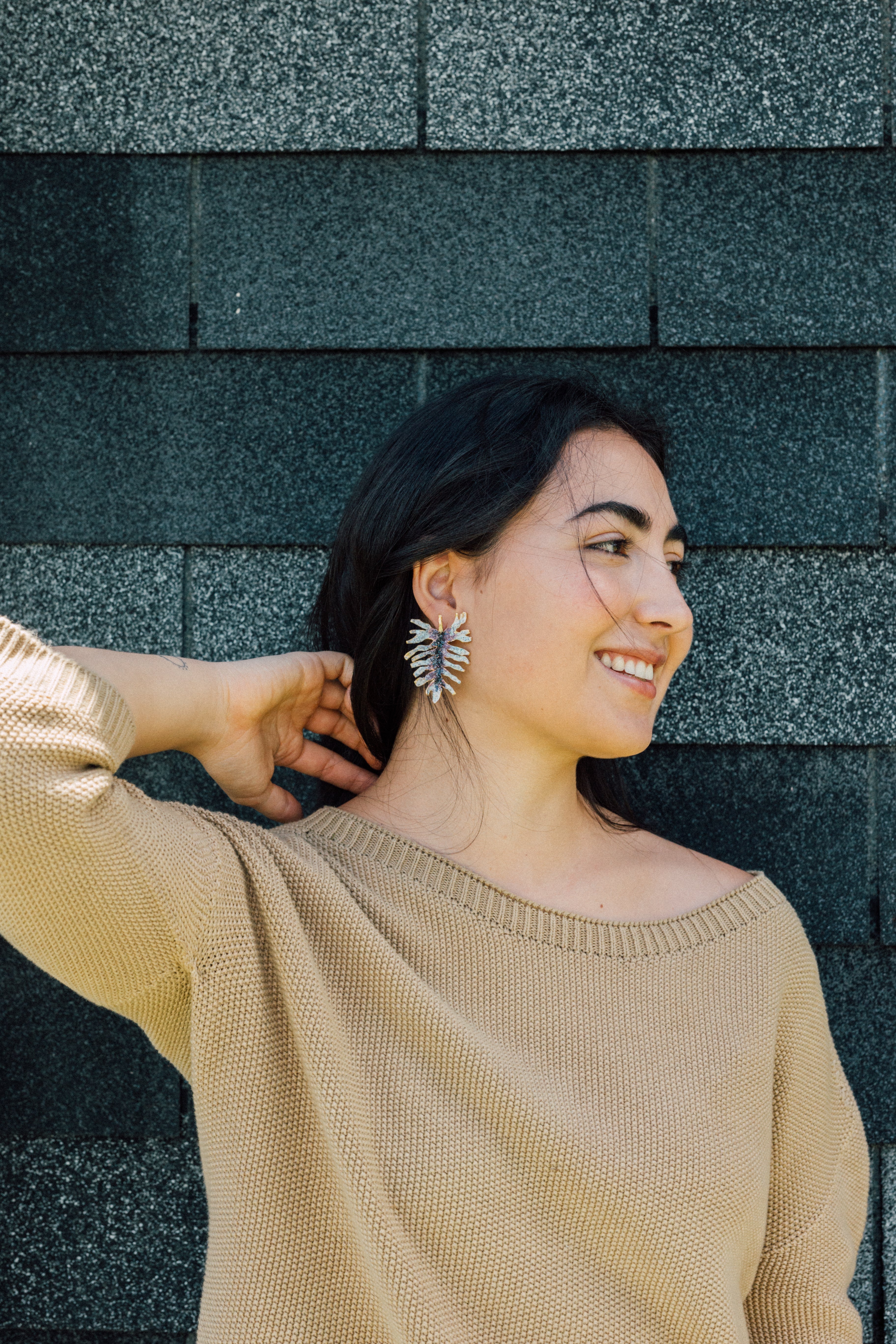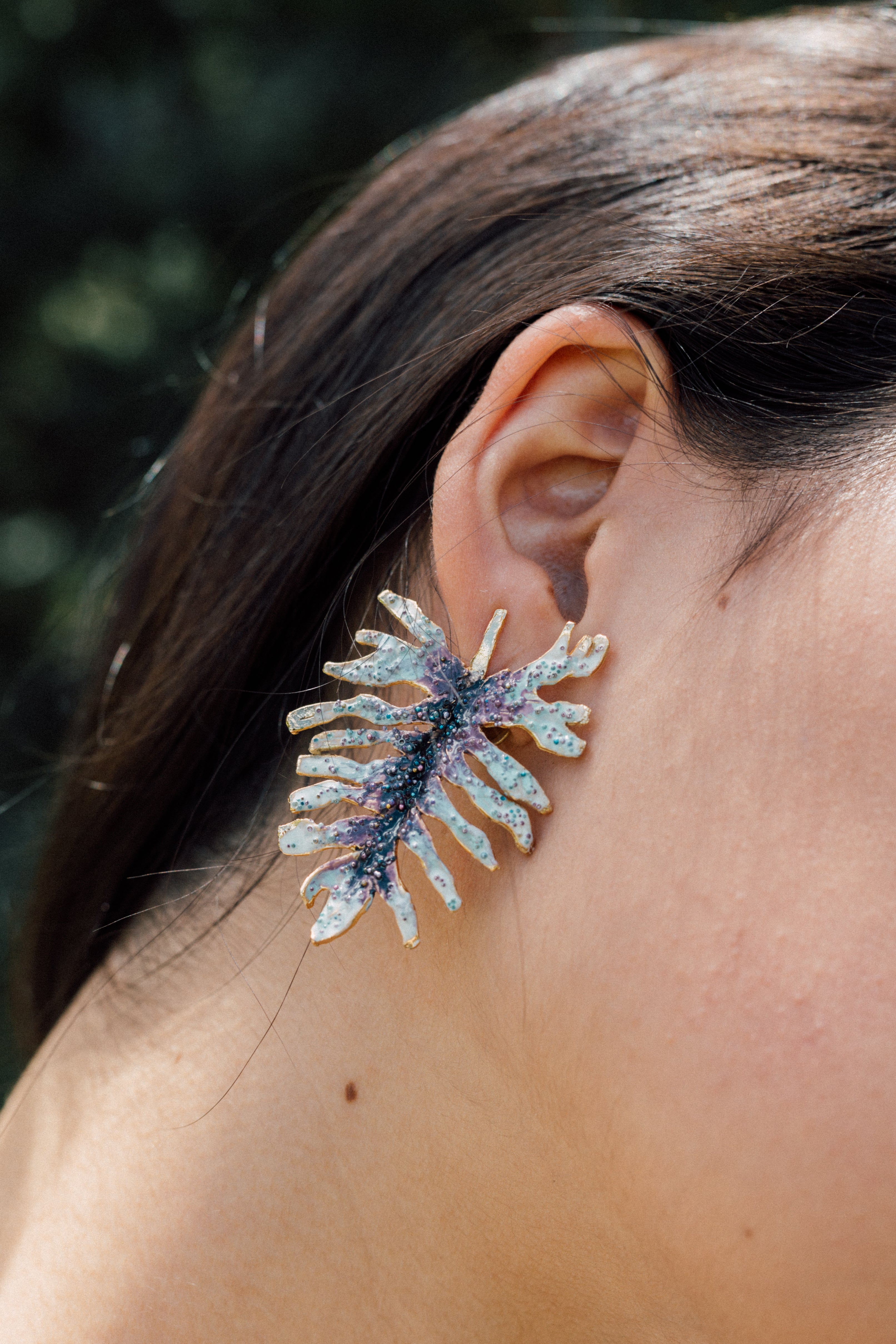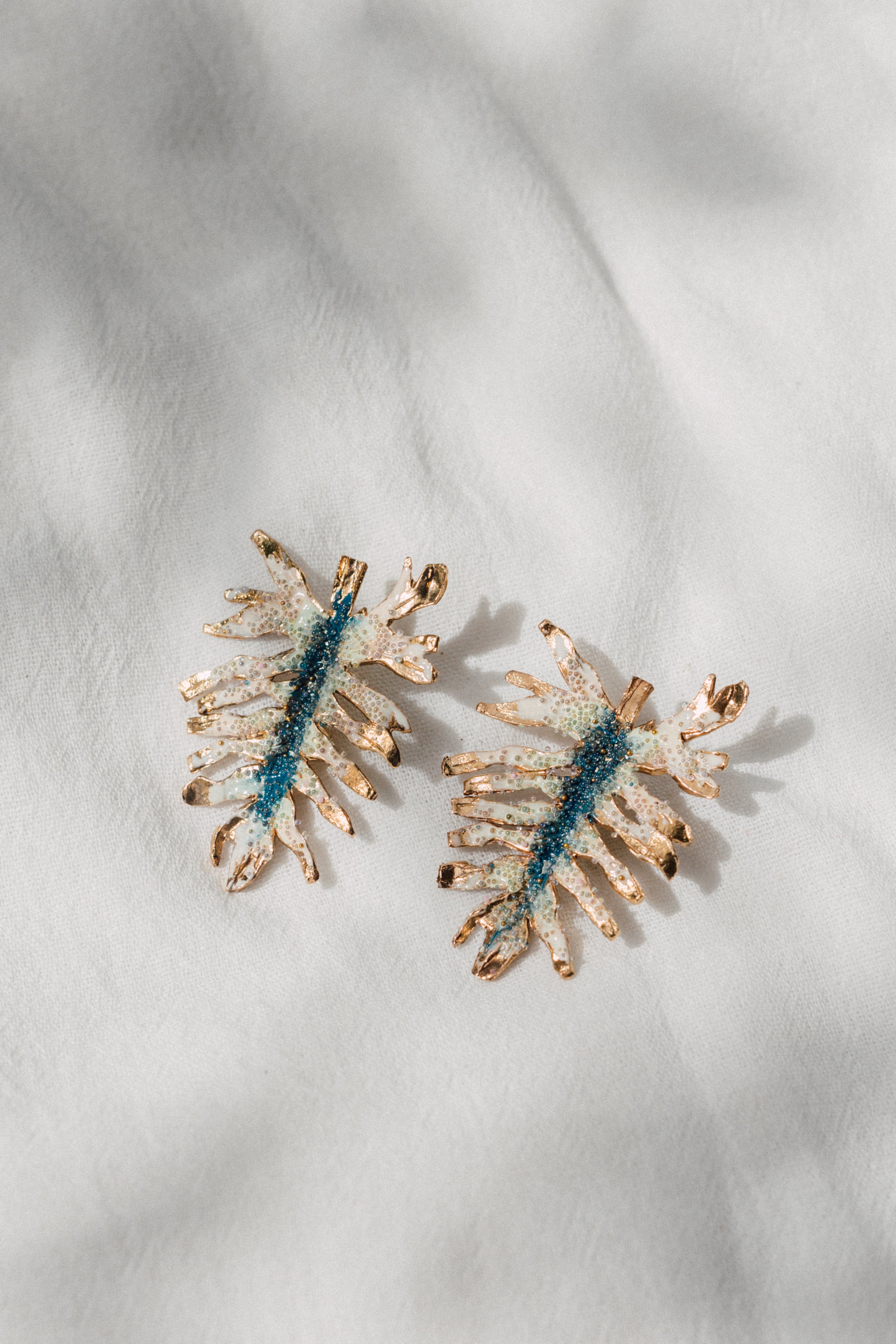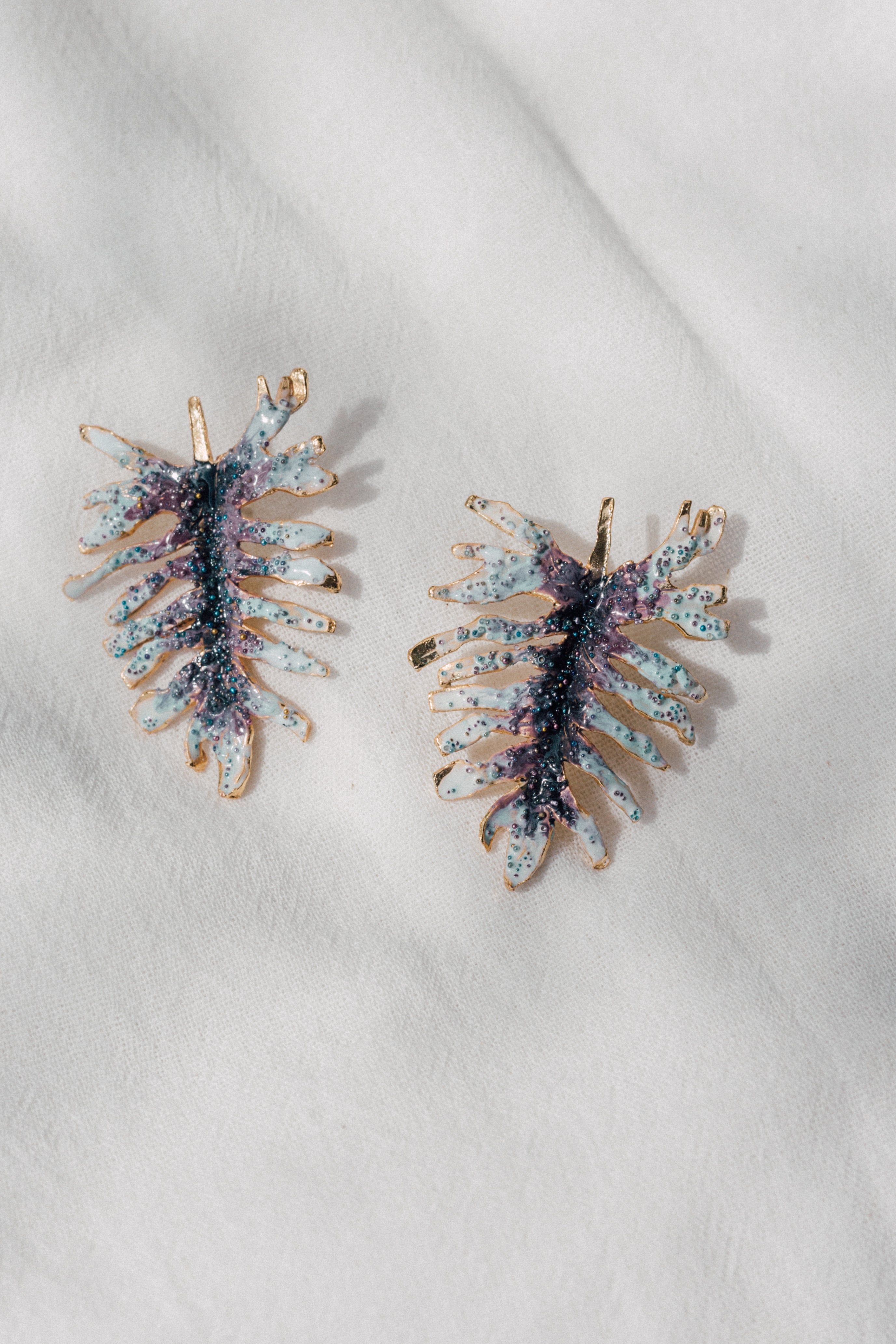 Disposición plana de dos aretes Topos Nebula Mini en forma de hoja pintados a mano en verde con granulación de vidrio, acompañados de un topo redondo de bronce bañado en oro colocado aparte, sobre superficie blanca.