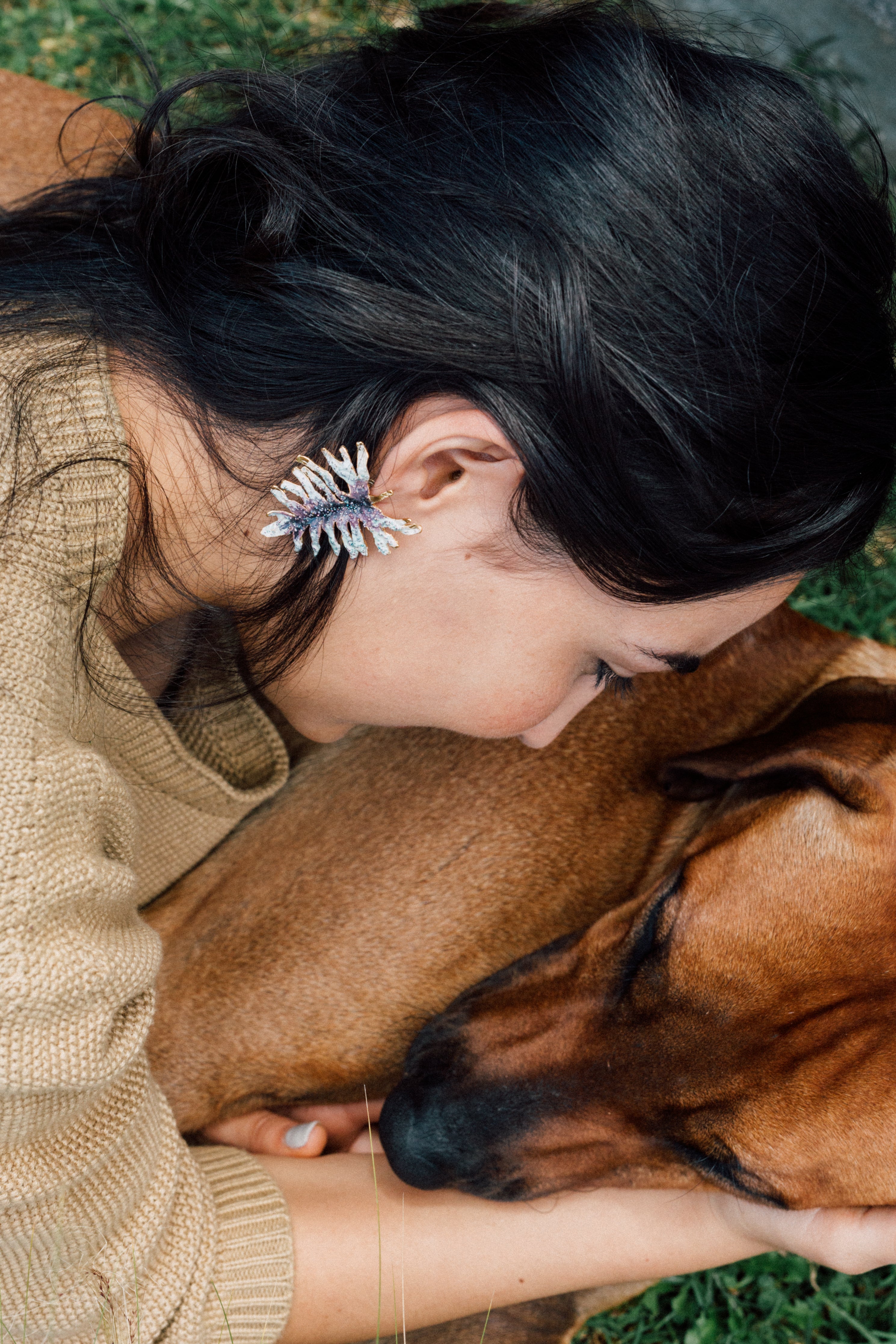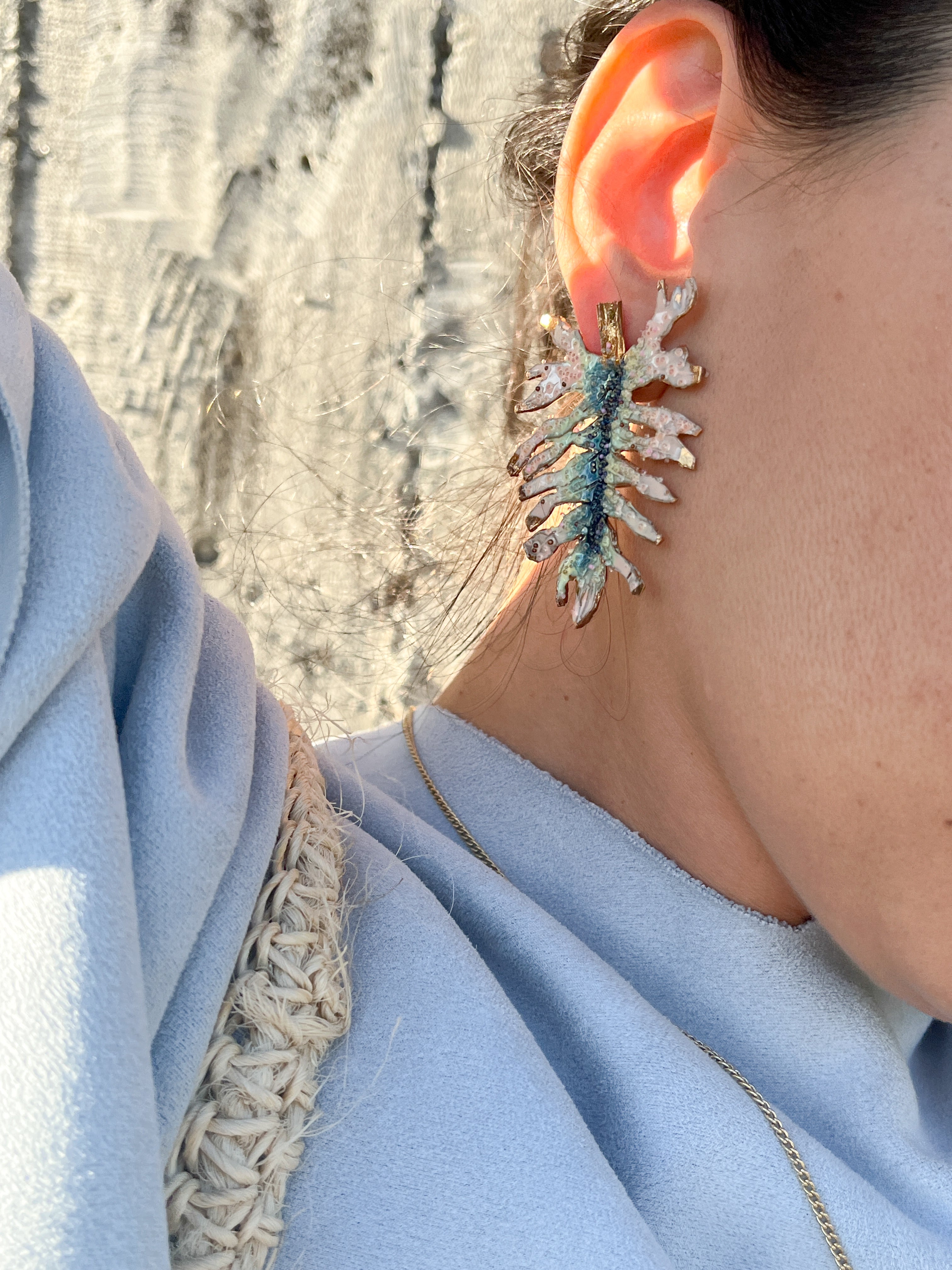 Primer plano lateral de la oreja de una mujer luciendo un arete Topos Cucu en bronce bañado en oro, pintado a mano en rosa con granulación de vidrio, cabello recogido detrás, sobre fondo neutro.