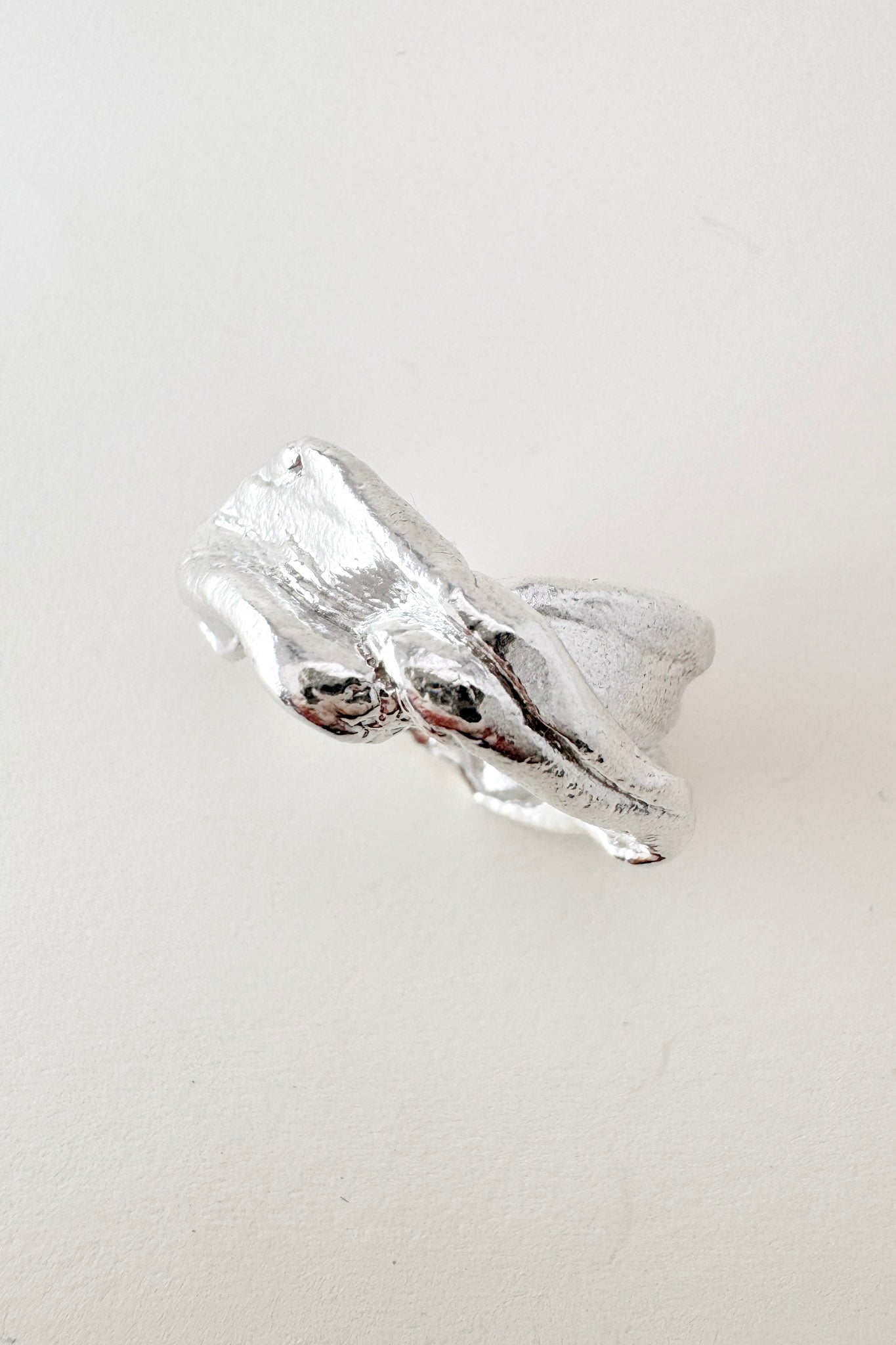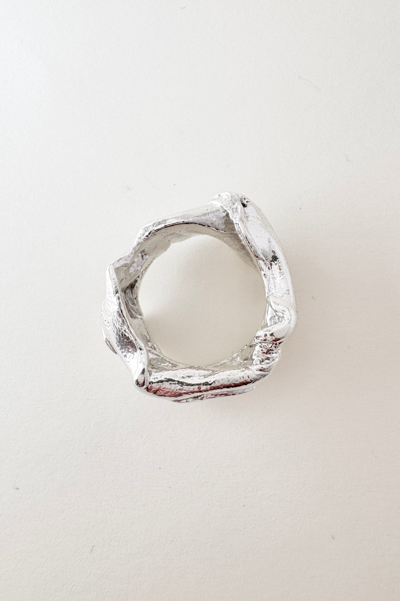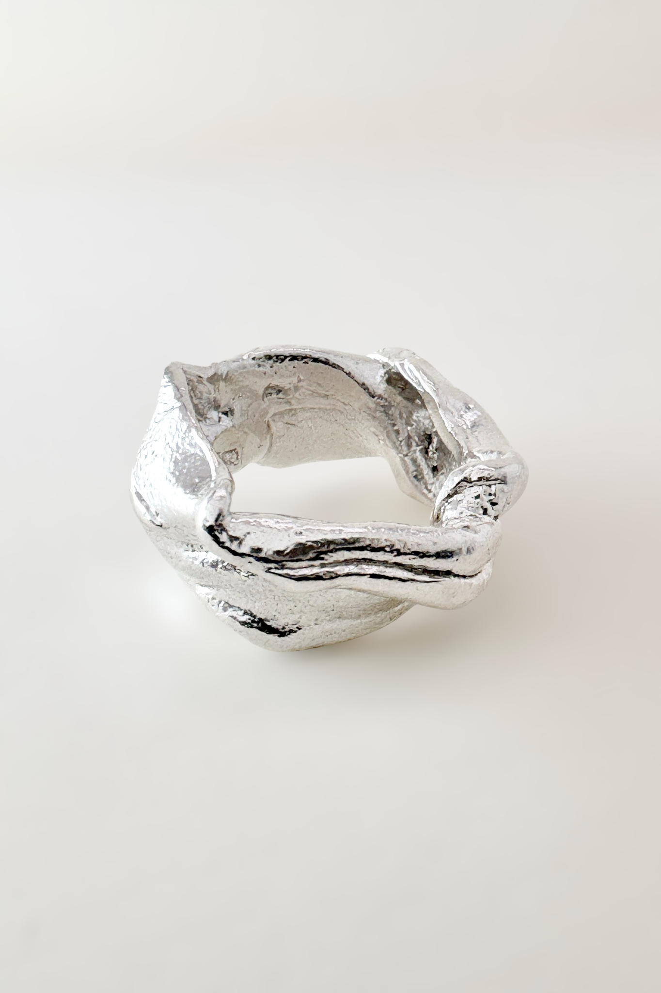 Plegados es una serie de anillos escultóricos hechos en plata, inspirados en los procesos naturales que dan forma al paisaje: capas que se doblan, materiales que ceden, surcos que aparecen con el paso del tiempo.