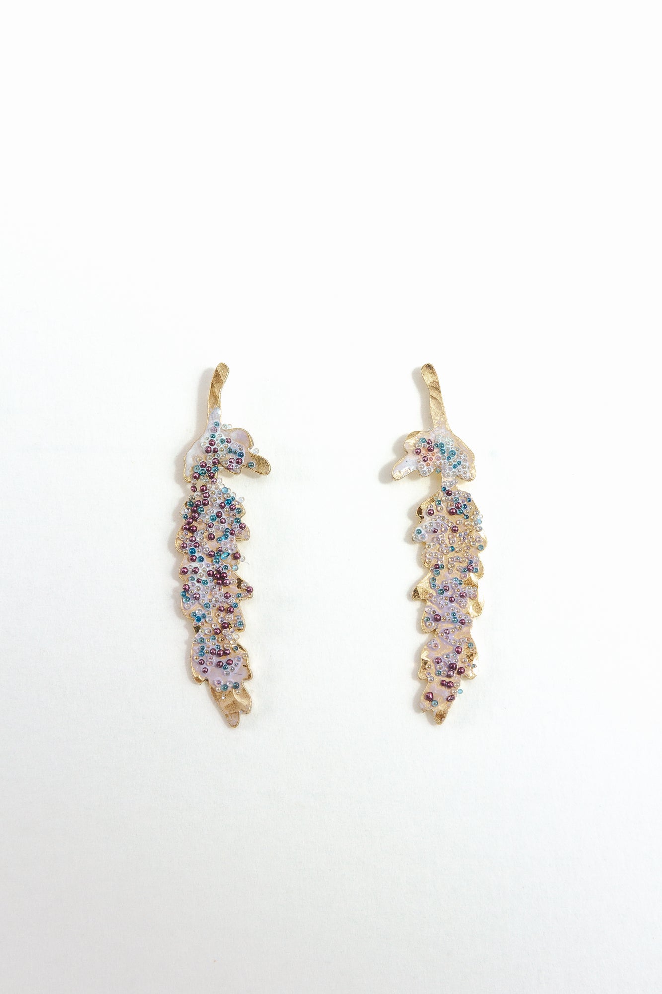 Par de aretes topos Nebula Mini en bronce bañado en oro, pintados a mano en  rust y con granulación de vidrio, sobre fondo blanco.