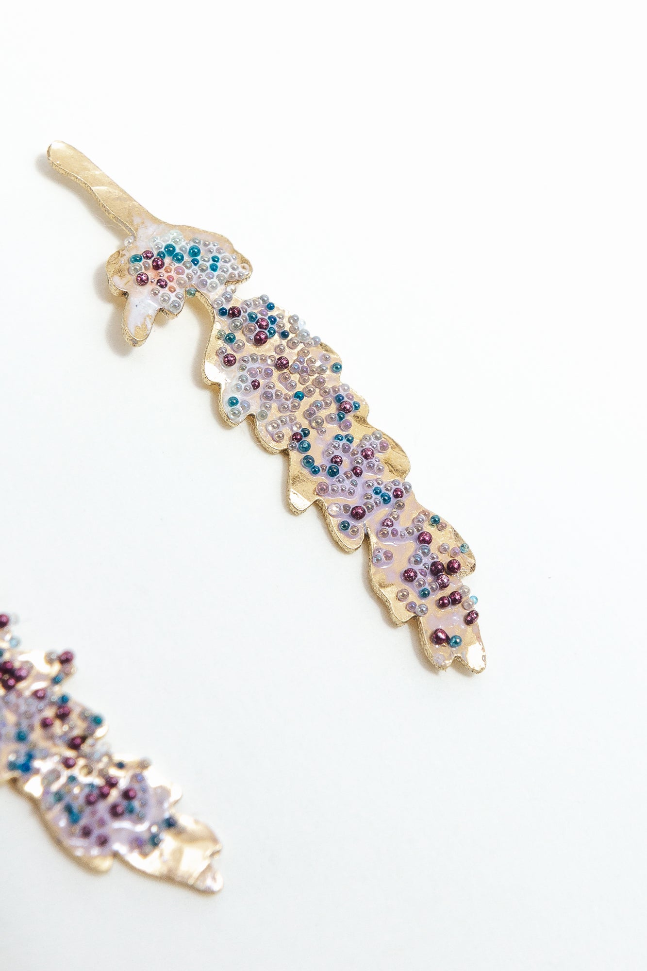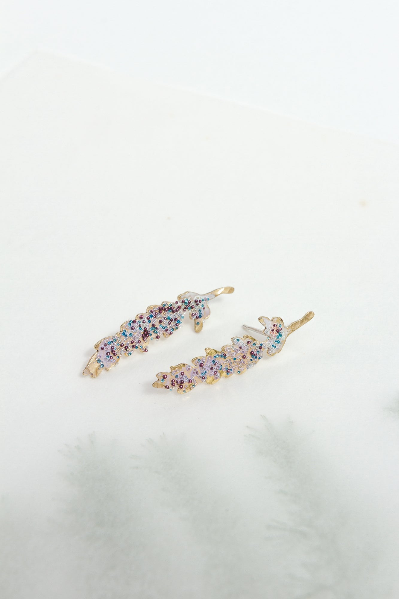 Disposición plana de dos aretes Topos Nebula Mini en forma de hoja pintados a mano en verde con granulación de vidrio, acompañados de un topo redondo de bronce bañado en oro colocado aparte, sobre superficie blanca.