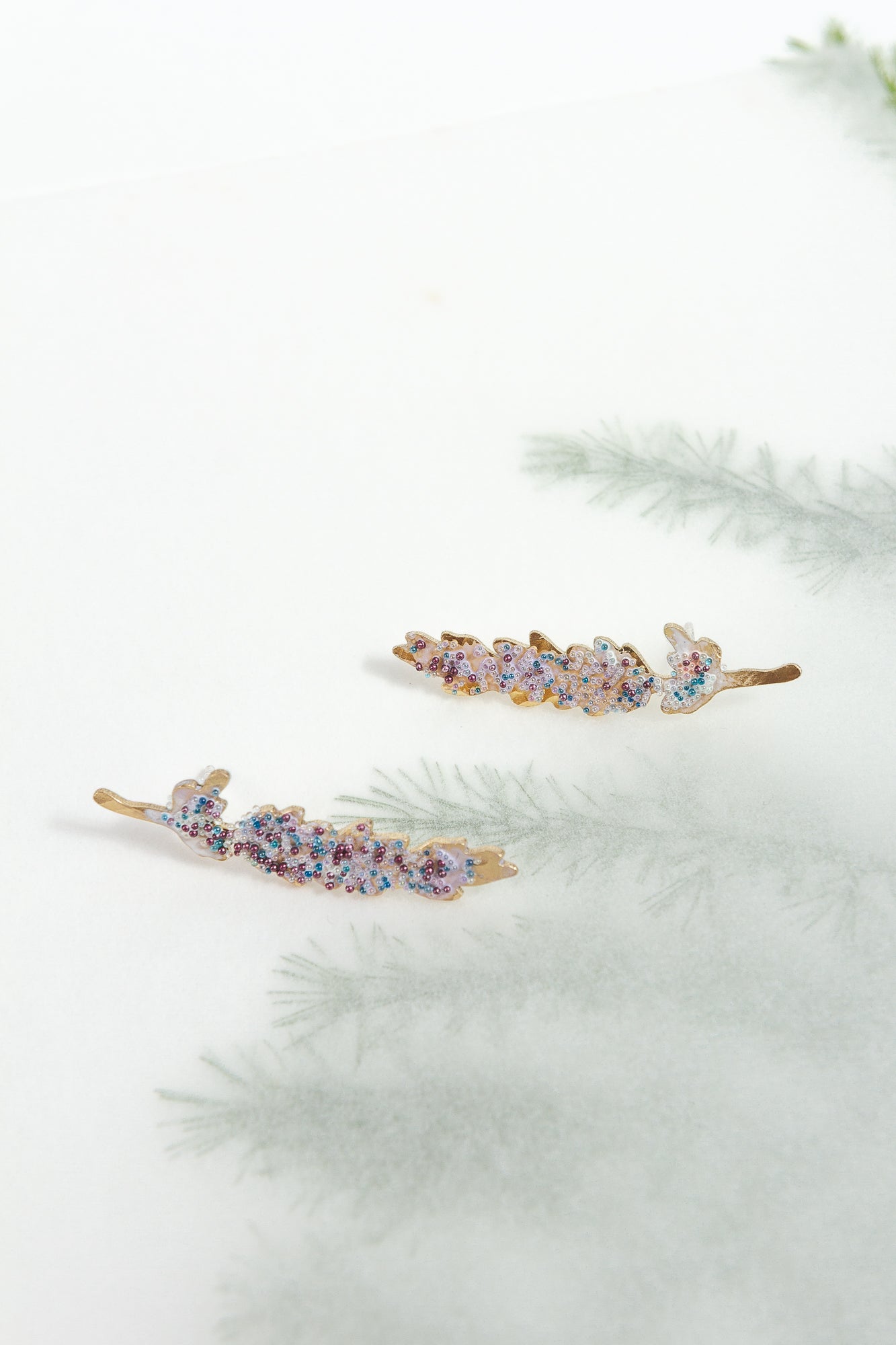 Cada pieza de esta colección es creada una a una, observando las plantas y nuestro entorno. Se modela primero en cera, se funde en metal y luego se baña y se pinta cuidadosamente, también una a una, un proceso lento... artesanal