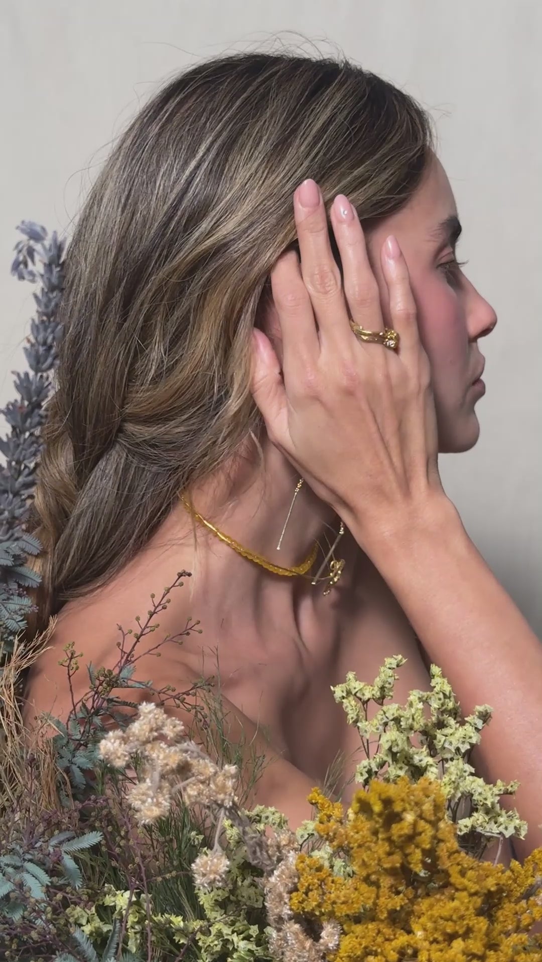 Modelo usando la Candonga Espiga en una escena natural rodeada de follaje, resaltando el estilo botánico y artesanal de la joya.