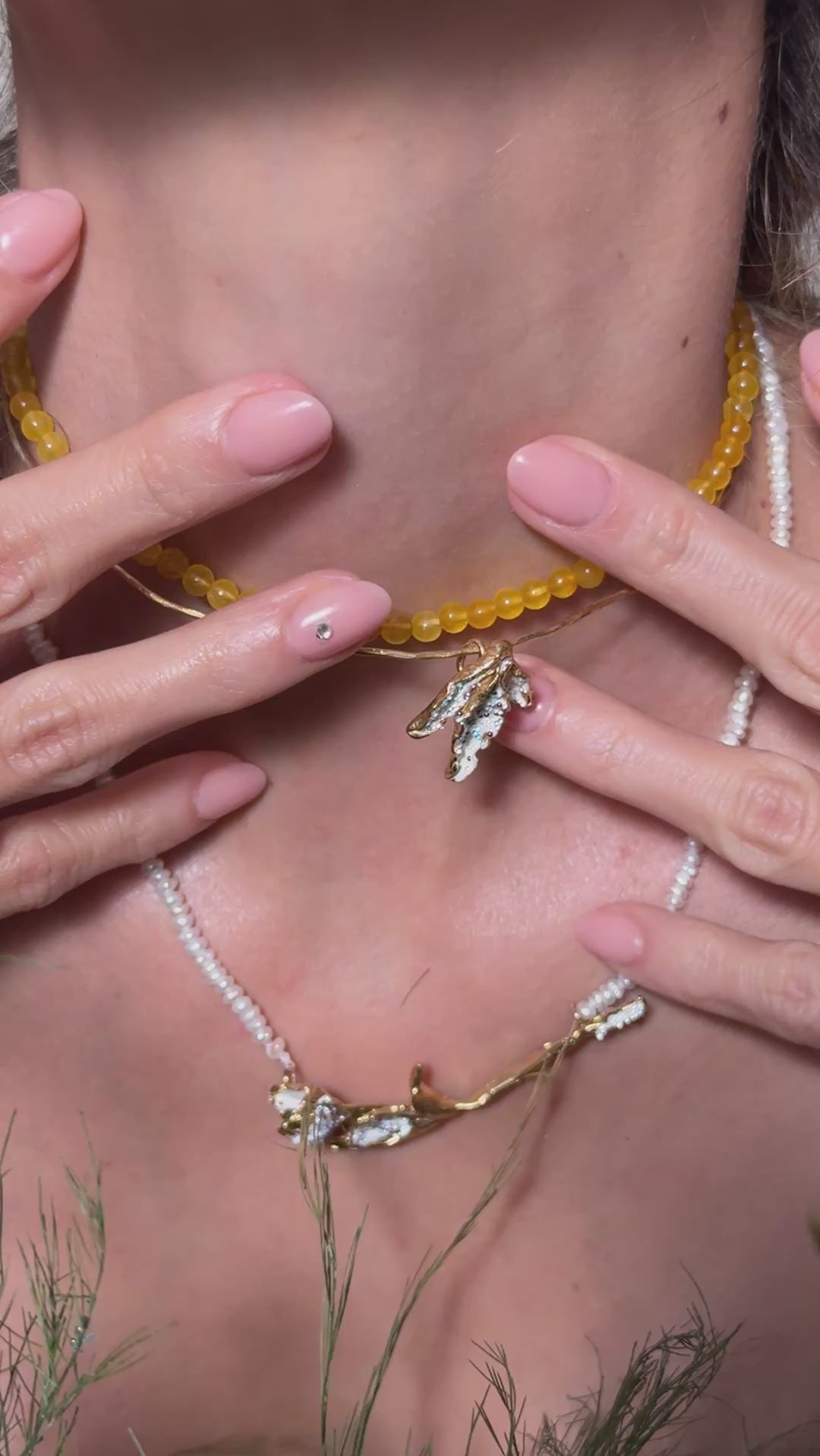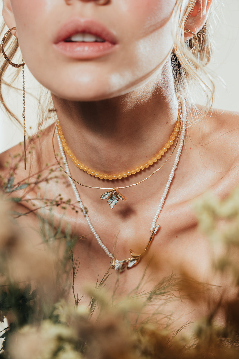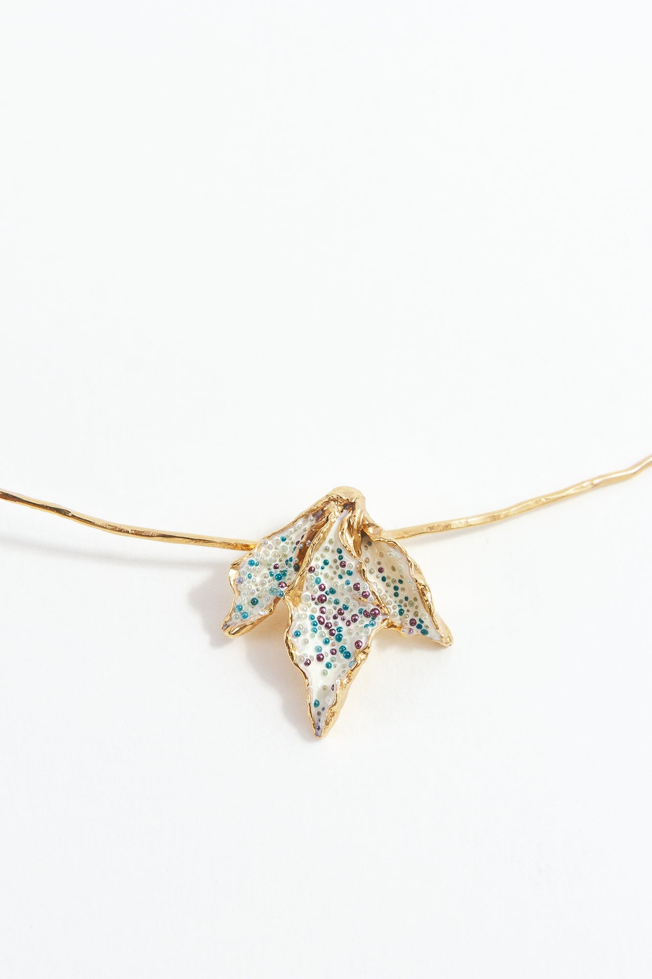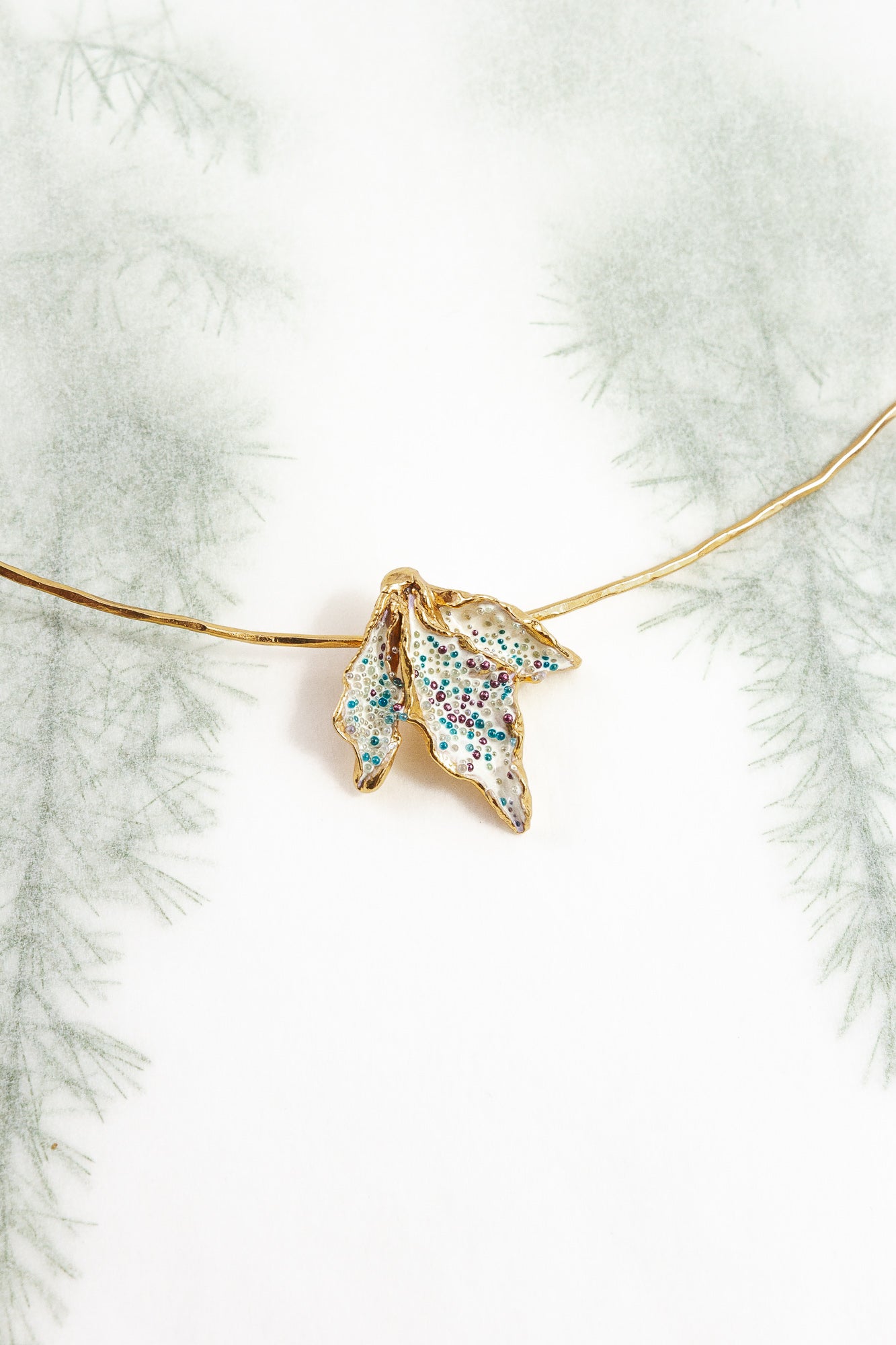 Cada pieza de esta colección es creada una a una, observando las plantas y nuestro entorno. Se modela primero en cera, se funde en metal y luego se baña y se pinta cuidadosamente, también una a una, un proceso lento... artesanal