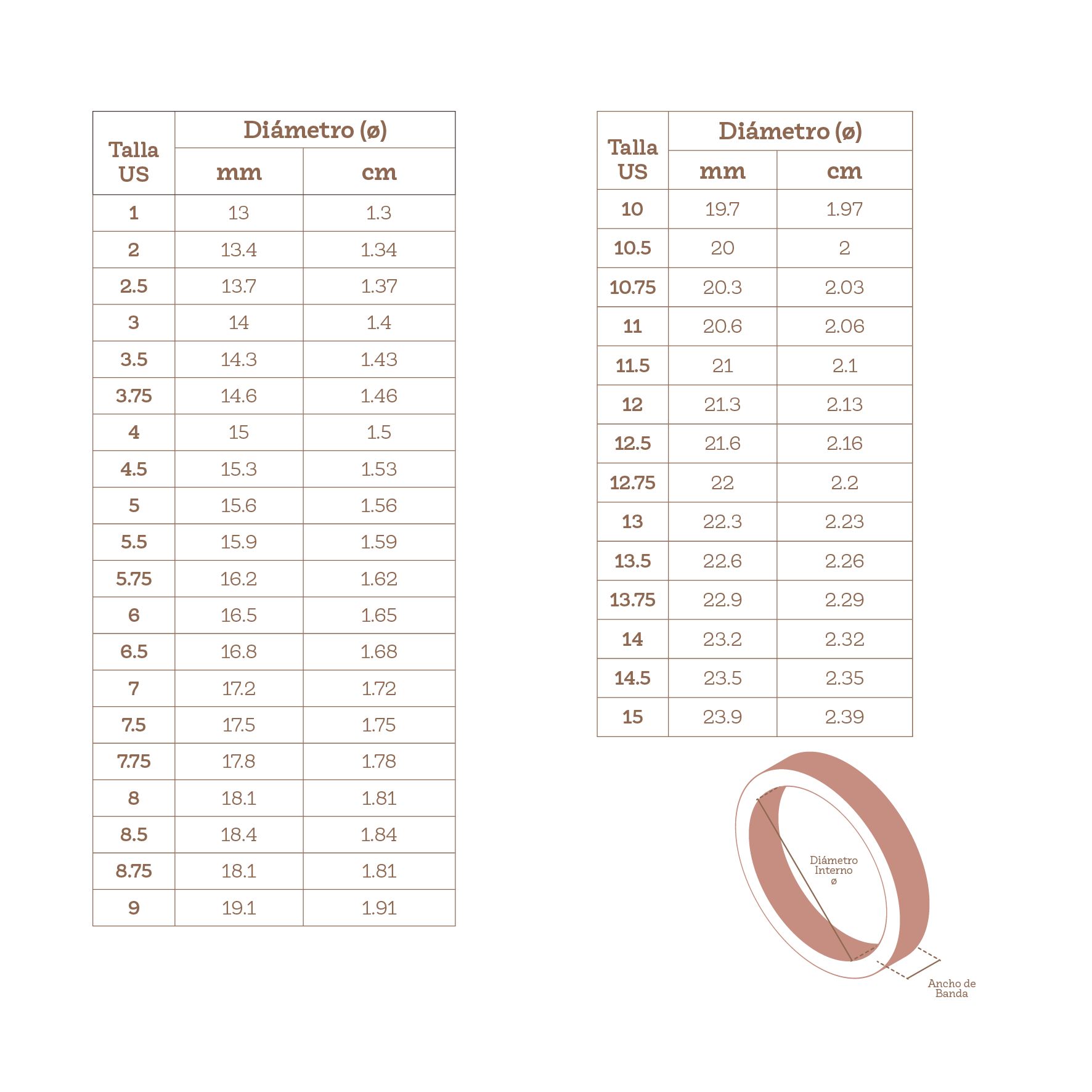 Una vez tengas el valor del diámetro (⌀) interno, consulta nuestra Guía de Tallas (al final de esta página) para conocer a qué talla corresponde.